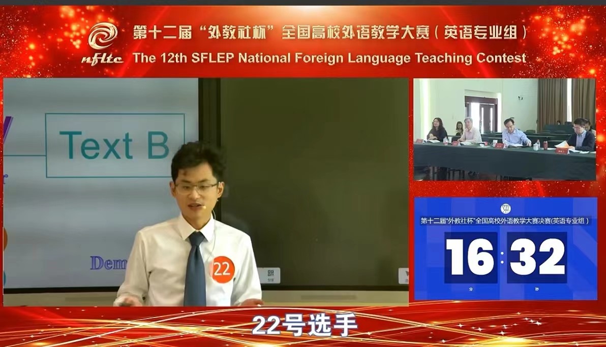 (供稿 英语系)2022年9月25日,第十二届“外教社杯”全国高校外语教学大赛全国总决赛圆满落幕。经过三天的激烈角逐,太阳成官网英语系青年教师杨雨箫博士荣获英语专业组全国一等奖的第一名。此次比赛由上海外国语大学主办,上海外语教育出版社承办,比赛采用选手在线授课、评委线上线下评审的形式。大赛在网络同步直播,吸引了数十万人次在线观看,盛况空前。