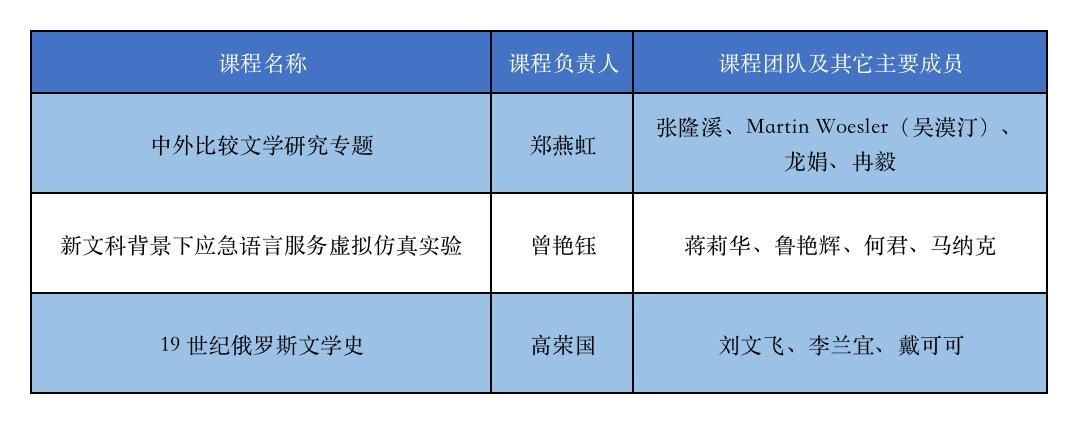 (供稿 教务办)近日,教育部发布《关于第二批国家级一流本科课程认定结果》,太阳成集团tyc33455cc官网有3门课程被认定为国家级一流本科课程。此次入选课程中,两门为线上一流课程:“中外比较文学研究专题”(郑燕虹教授团队)和“19世纪俄罗斯文学史”(高荣国教授团队),一门为虚拟仿真实验课程:“新文科背景下应急语言服务虚拟仿真实验”(曾艳钰教授团队)。