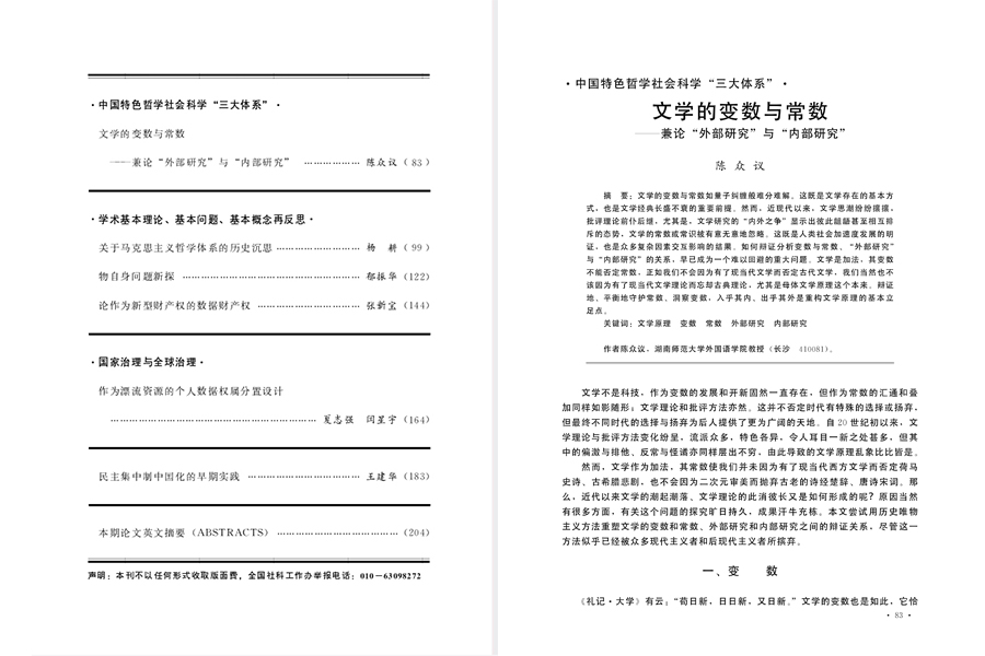近日,太阳成官网陈众议教授在《中国社会科学》2023年第4期发表了题为《文学的变数与常数——兼论“外部研究”与“内部研究”》的重要文章。