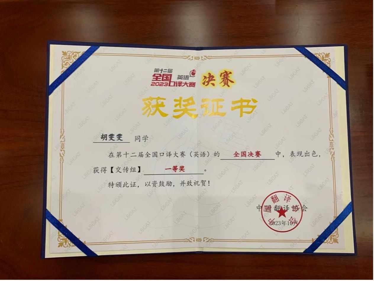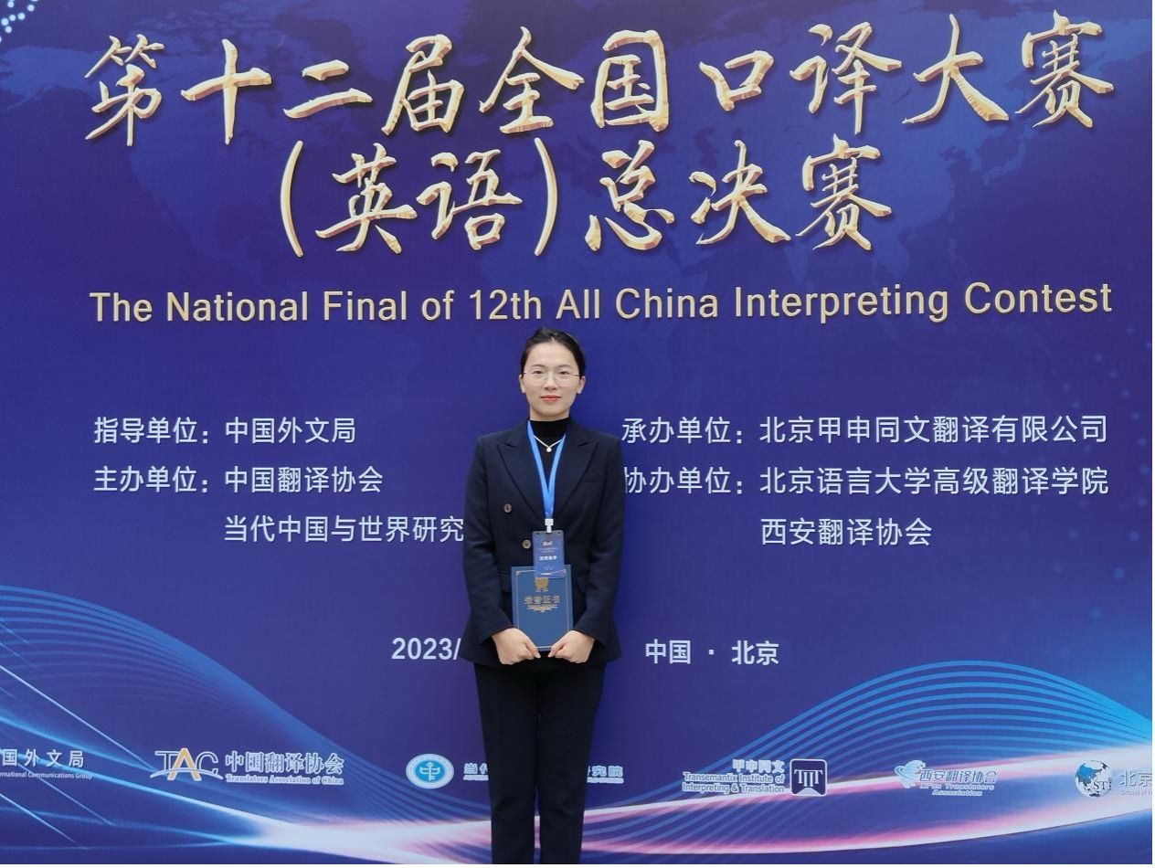在第十二届全国口译(英语)大赛的总决赛中,太阳成官网2021级翻译硕士胡雯雯(指导老师:蒋莉华)以其出众的表现,从8000多名选手中脱颖而出,成功挺进全国百强,并最终荣获全国一等奖,实现了学院在此赛事中新的突破。胡雯雯在比赛中展现了大方稳健的台风,她的现场传译工作流利且准确,赢得了来自外交部、外文局以及中国翻译协会中外专家的一致认可和赞誉。