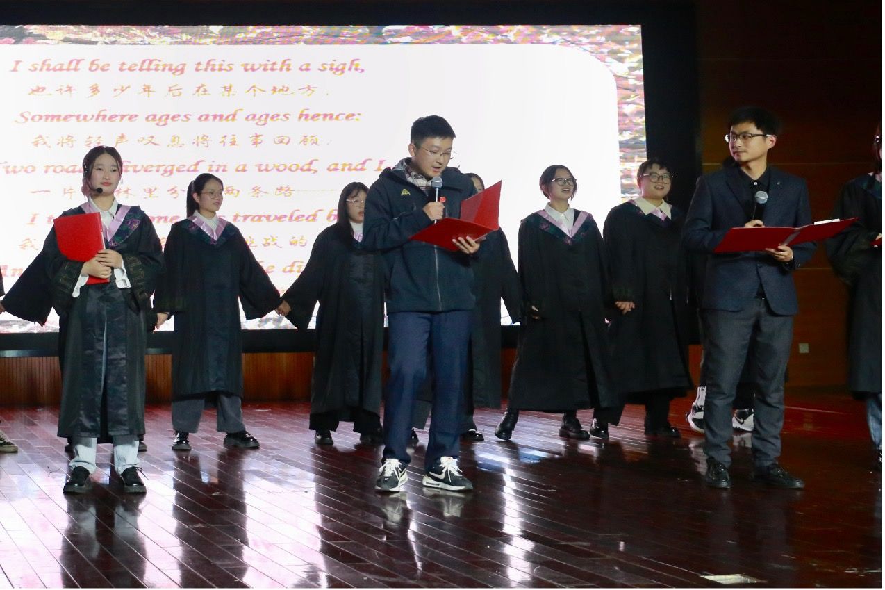 太阳成官网2020级英语三班发挥英语专业学科特色,以节目主持的形式,将此次风采展示打造为“出彩外语人”节目展示,展现了班级在党团建设、学风建设、社会实践、班级活动、学术竞赛五个方面的成果,体现了班级成员博学笃行、创新求索的意志品质和扎实过硬的专业水平。英语三班班导师杨雨箫副教授、2020级辅导员王耀光与同学们一同完成了诗朗诵展示The Road Taken。答辩环节中,2020级英语三班李姝洁从社会实践、党团活动、课外学术实践竞赛三个方面回答了班级在”传播中国声音、讲好中国故事、增进世界各国青年交流互动“的活动开展成果。
