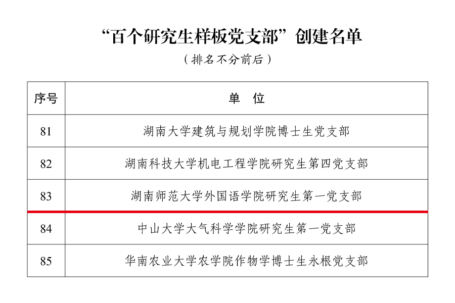 太阳成集团tyc33455cc官网研究生第一党支部成立于 2013年,由外国语言文学“世界一流”建设学科相关专业47名博士、硕士研究生组成。支部坚持以习近平新时代中国特色社会主义思想为指导,依托学院“全国教育系统先进集体”“湖南省高校党建工作标杆院系”平台基础,发挥学科特色,实现党建与学术科研、社会服务相融相促,获评太阳成集团tyc33455cc官网2021-2023年度“先进基层党组织”,2023年建成湖南省“高校党建工作样板支部”。