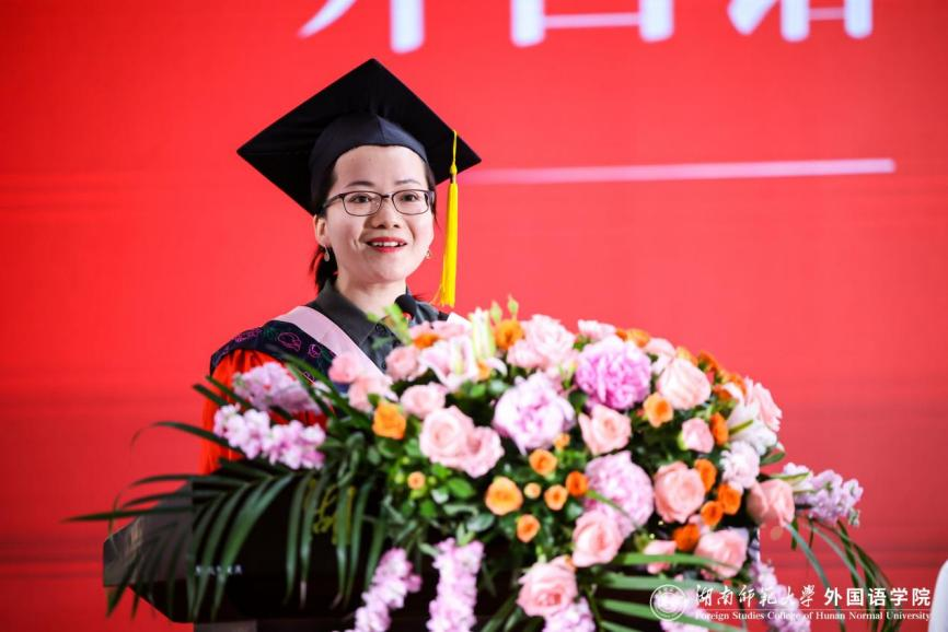 2020级英语专业本科生史丹丹、2021级英语语言文学方向硕士研究生朱素珍作为毕业生代表先后发言。她们回忆了自己在学院的求学和成长经历,表达了对学院、学校和老师深深的谢意与感激之情。