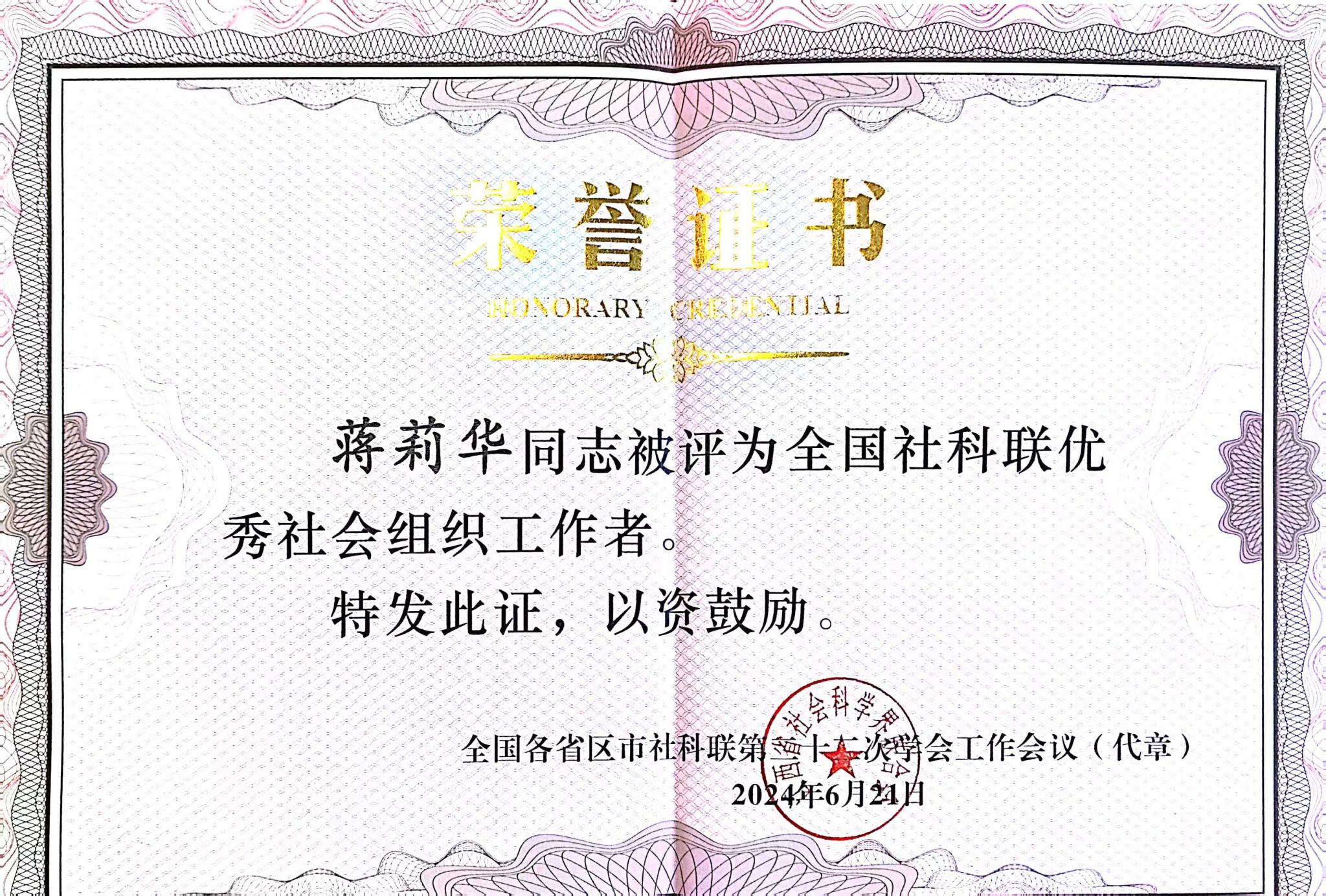 近日,全国各省区市社科联第二十二次学会工作会议在江西南昌召开,为进一步激发广大社科工作者的主动性和创造性,更好地发挥社科类社会组织、社科工作者在经济社会发展中的积极作用,经各省(自治区、直辖市)社科联推荐,会议颁布了《关于表彰全国各省区市社科联先进社会组织和优秀社会组织工作者的决定》,表彰了151个先进社会组织、149名优秀社会组织工作者。我校太阳成集团tyc33455cc官网教师蒋莉华获评全国各省区市社科联优秀社会组织工作者。