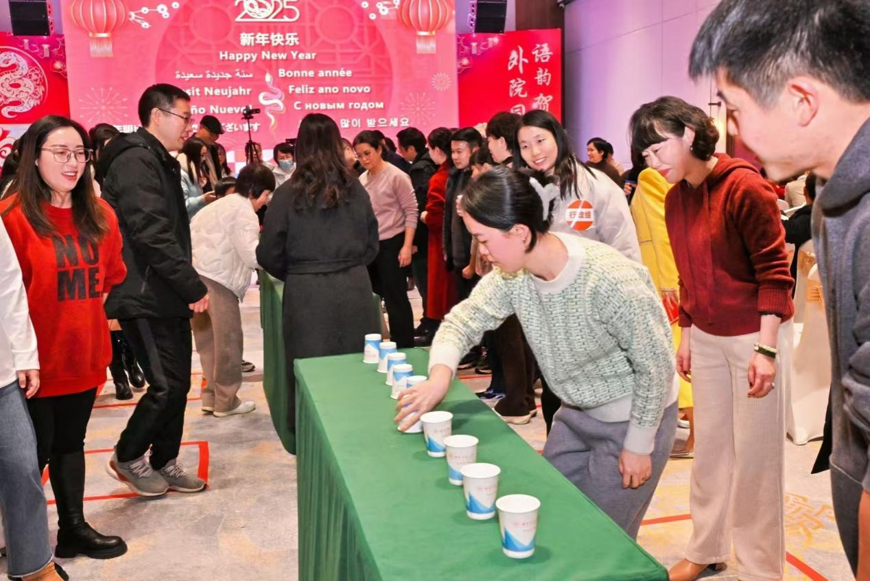 联欢会还穿插了多轮抽奖环节和集体互动游戏,文学文化、语言学、区域国别、翻译与传播、外语教育与实践和行政六个工会小组以团队形式参与游戏比拼。巧思妙想的游艺翻杯快手、一掷千金、昂首阔步、快乐传真趣味横生,各个团队精密配合,默契十足,现场欢声笑语不断。抽奖环节,期待的欢呼声将联欢会推向高潮。最后,在快乐的歌舞声中联欢会落下帷幕。