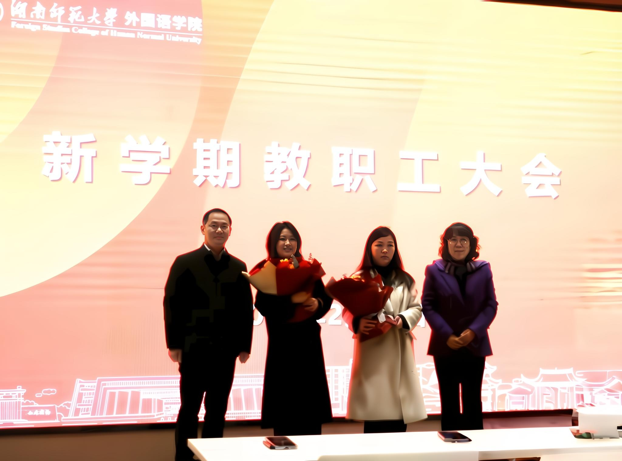 沈贤岚首先隆重介绍了新加盟学院的三位博士,曾艳钰代表学院向新引进教师鲜花并佩戴校徽。