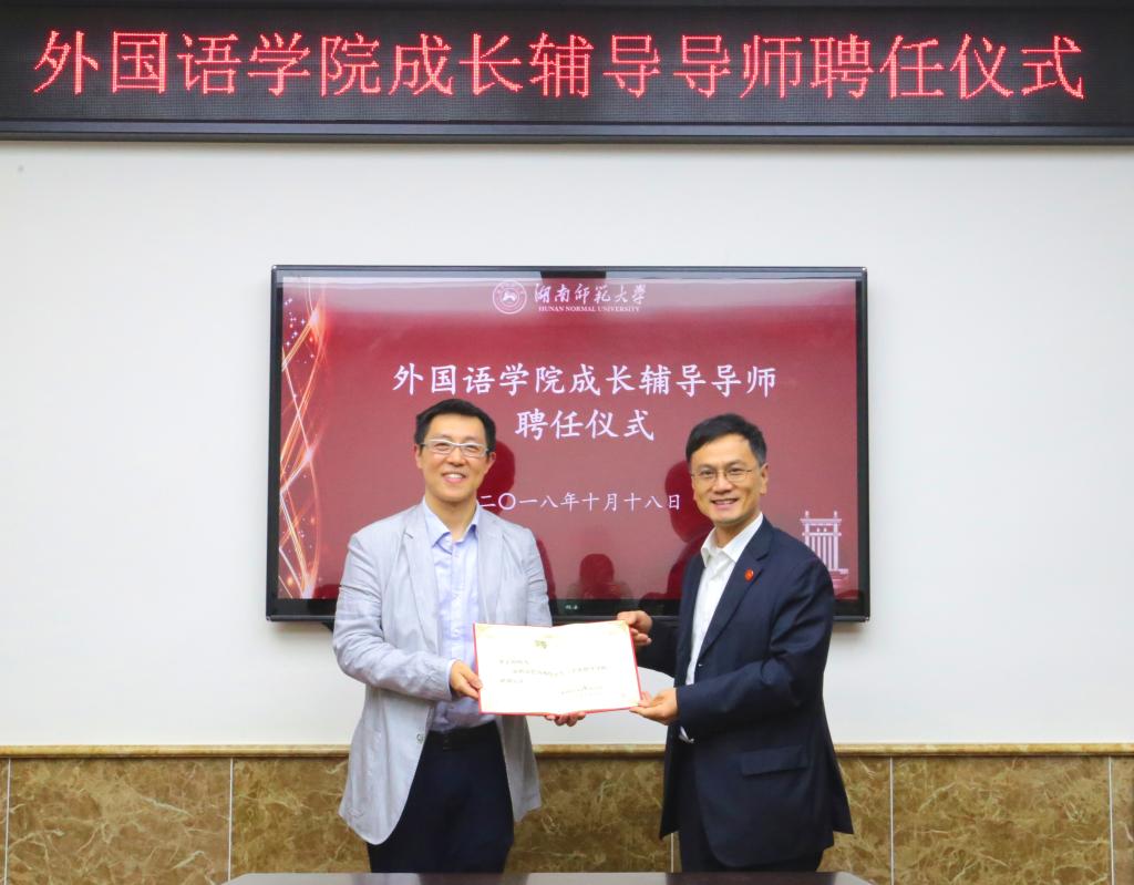 唐建文代表学院聘任廖志阳为“学业辅导导师”并为其颁发证书。他以老师的身份回顾了与学生廖志阳之间的大学往事,肯定了他的优秀是其自身勤奋好学、努力拼搏的结果,是学院对其孜孜培育的结果。同时,唐建文希望同学们以优秀学长廖志阳为榜样,根据国家和社会需要,树立远大理想,合理规划大学,通过努力行动实现目标。最后,他代表学院邀请廖志阳校友回校为翻译系学生开设专业教育讲座。