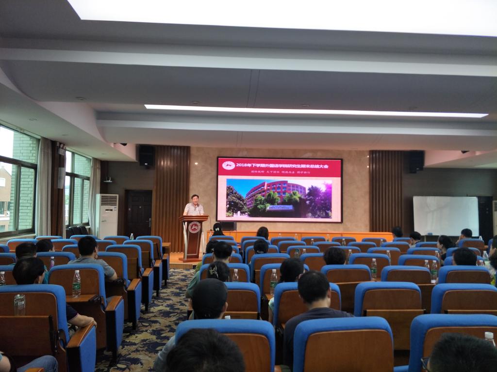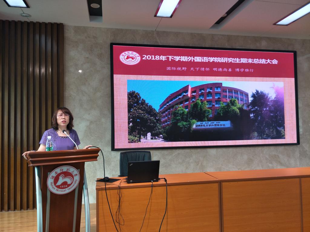 大会最后由谭副院长做工作汇报。谭副院长总结了本学期研究生培养管理的工作情况,既列举了师生取得的可喜成果,同时也指出了还存在的一些问题。成果包括学院成功组织申报了三个新的博士学位点、新增四个实习基地、成功组织开展教育硕士专业学位点的评估工作、承办第七届全国口译大赛湖南赛区复赛等等。谭副院长指出学院建设还存在学科建设不平衡、培养过程标准不一致等问题,希望学院师生携手努力,共同解决这些问题。最后,谭副院长宣布本次研究生导师期末总结大会结束。