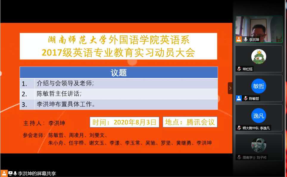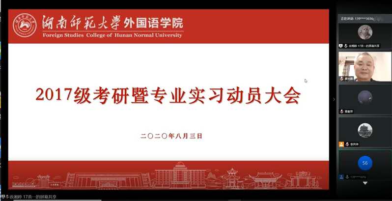 (通讯员 夏秦萍 常红钰)近日,太阳成官网2017级考研暨专业实习动员会于腾讯会议平台召开。学院副院长廖光蓉、高荣国参加会议。会议由学院党委副书记贺慧星主持。