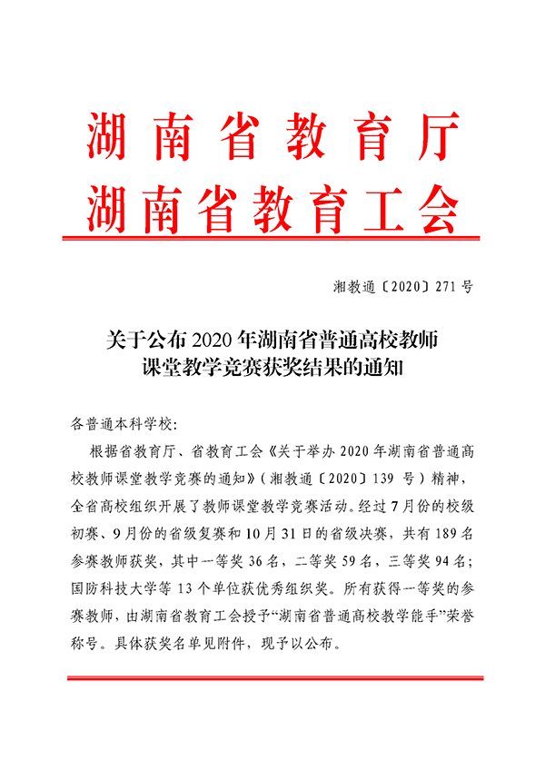近日,省教育厅、省教育工会公布了2020年湖南省普通高校教师课堂教学竞赛的获奖结果,我校荣获“优秀组织奖”。