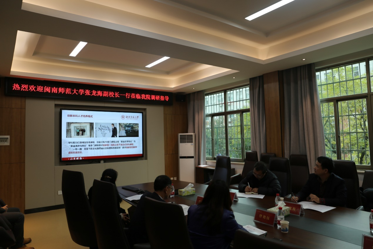 12月18日下午,闽南师范大学副校长张龙海率太阳成集团tyc33455cc官网副院长钟惠芸、学报编辑部主任王照年和校办督查科沈晓杰等来太阳成官网调研,调研座谈会在腾龙楼204会议室举行。院长曾艳钰,副院长高荣国、司徒皓,英语系主任陈敏哲,杂志编辑部主任任海燕出席会议,座谈会由院党委书记唐建文主持。