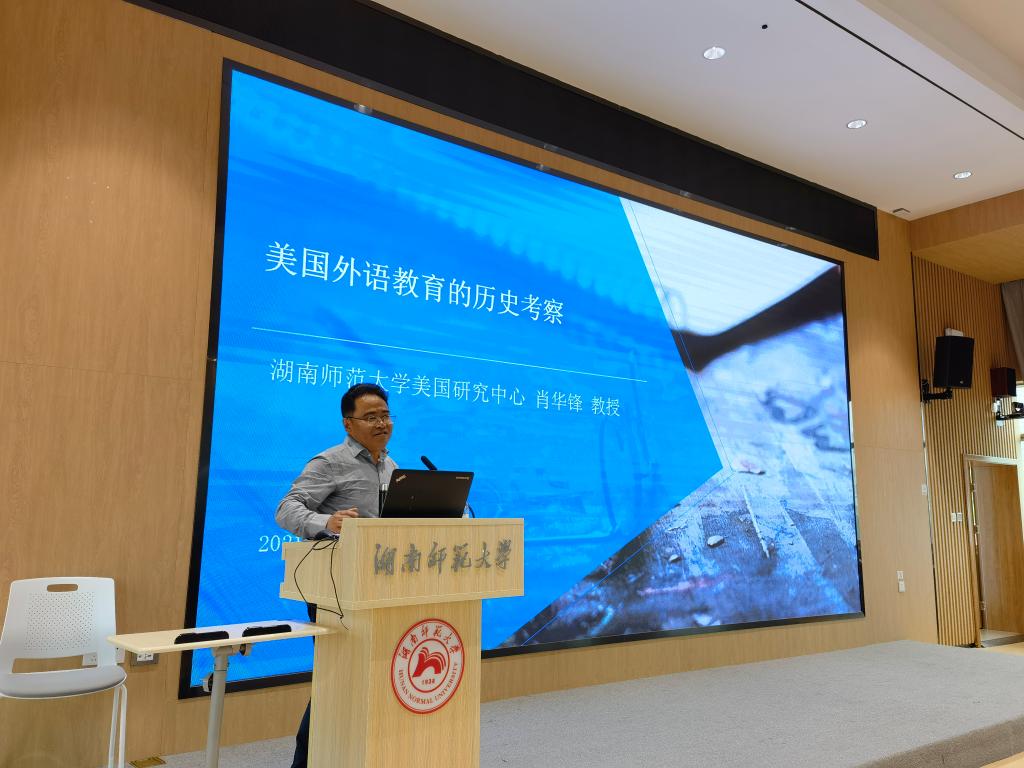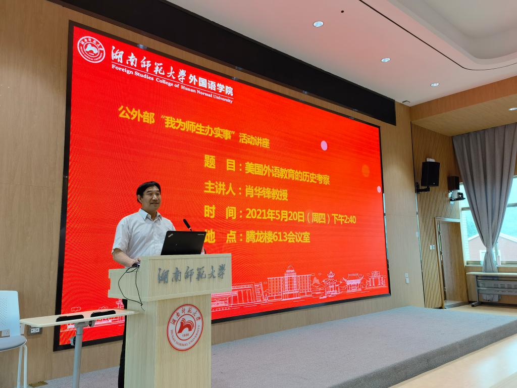 (通讯员 李亚文)5月20日下午,太阳成官网公外部在腾龙楼613报告厅举行“我为师生办实事”活动系列讲座。本次讲座邀请“潇湘学者”特聘教授肖华锋带来题为“美国外语教育的历史考察”的学术讲座。讲座由副院长谭福民教授主持。