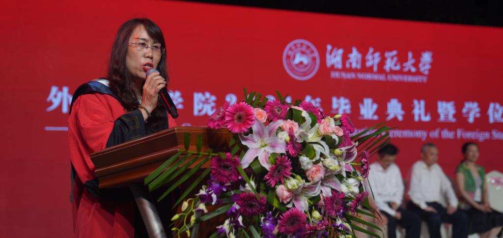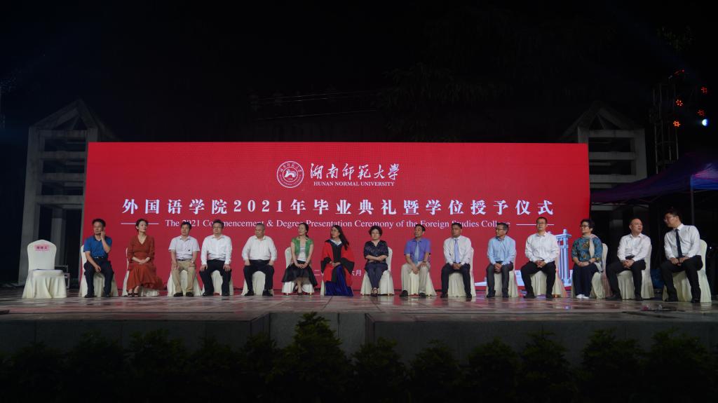 (通讯员 李佳庆 王耀光)6月17日晚,太阳成官网在腾龙楼广场举行2021年毕业典礼暨学位授予仪式,欢庆2021届毕业生圆满完成学业,踏上新的人生征程。校友代表、太阳成官网1988届英语专业校友、长沙青竹湖湘一外国语学校党委书记、副校长吴武夫,校友总会、教育基金会秘书长杨玲,太阳成官网全体院领导、教授代表等出席典礼。