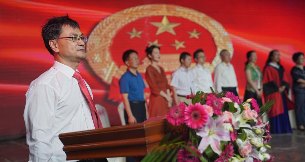 伴随着雄壮的国歌声,2021年毕业典礼暨学位授予仪式正式开始。院党委书记唐建文主持仪式。