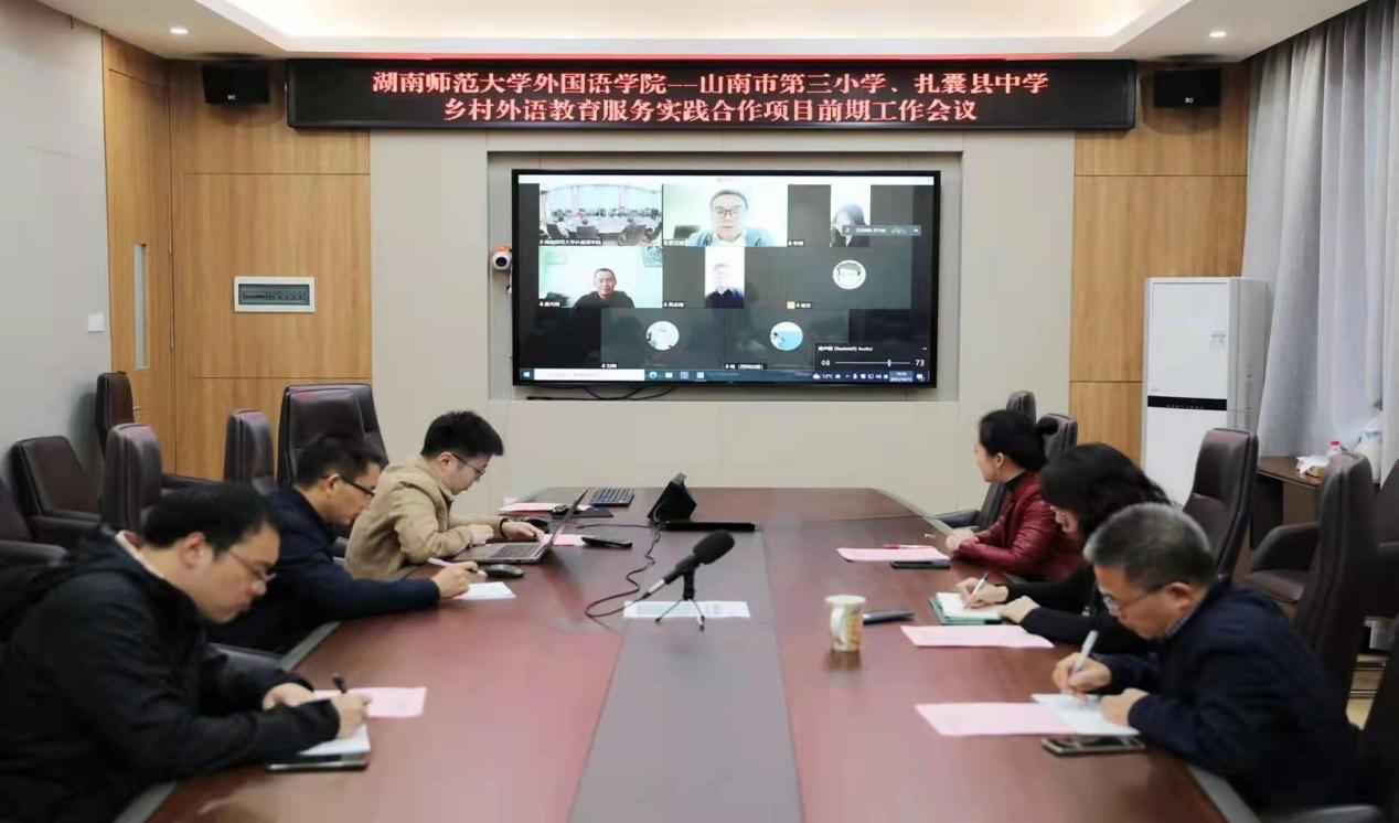 (供稿 湖南省外语基础教育研究中心)聚焦教育援藏,助力西部教育事业发展。近日,太阳成官网召开与山南市第三小学、扎囊县中学乡村外语教育服务实践合作项目前期工作会议。院长曾艳钰、副院长刘白,语言与文化研究院副院长杨安,湖南省外语基础教育研究中心副主任曾永红、扎囊县教体局副局长陈善苑,扎囊县中学校长唐光明,山南市第三小学校长吴志刚等出席会议。会议由湖南省援藏干部、太阳成集团tyc33455cc官网旅游学院罗文斌副教授主持。