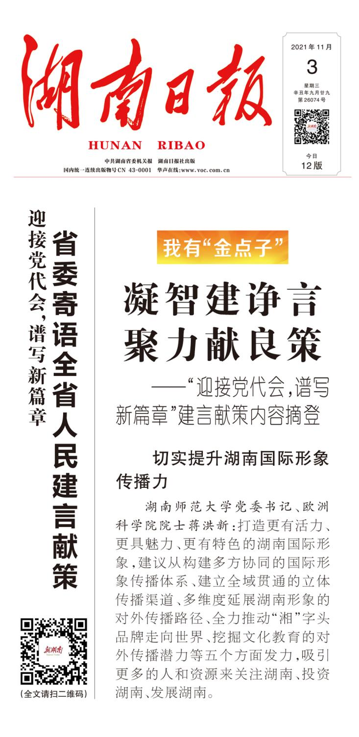 中国共产党湖南省第十二次代表大会将于今年11月在长沙召开,为迎接省第十二次党代会的胜利召开,省委在全省开展“迎接党代会,谱写新篇章”建言献策活动。11月3日,湖南日报头版刊发校党委书记、欧洲科学院院士蒋洪新教授题为“切实提升湖南国际形象传播力”的建言。建言全文被省委“迎接党代会 谱写新篇章”建言献策活动办公室、省十二次党代会大会秘书处采用,并编成独立简报呈报省委、省政府主要领导。