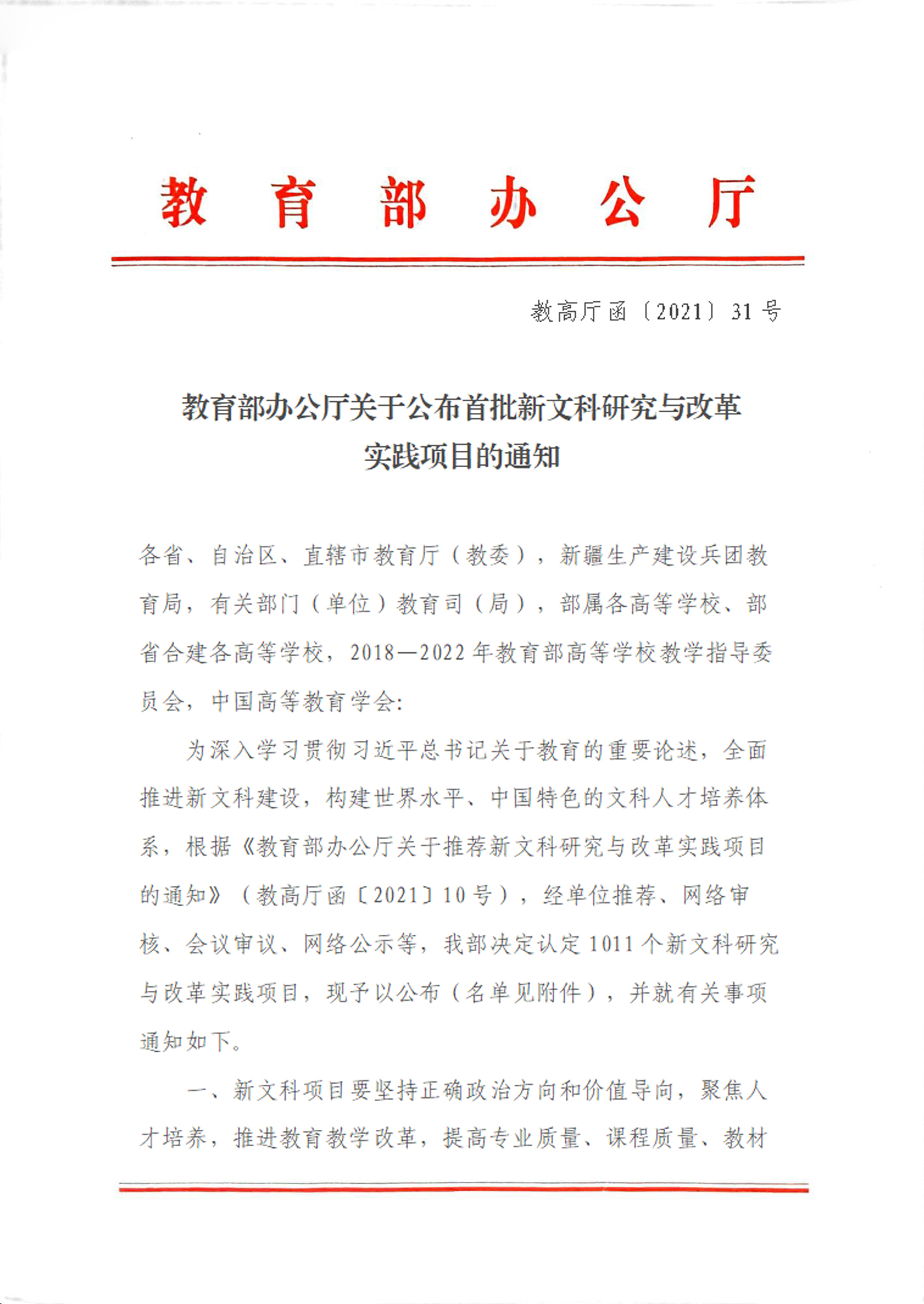 近日,教育部办公厅印发了《关于公布首批新文科研究与改革实践项目的通知》(教高厅函〔2021〕31号),欧洲科学院院士、校党委书记、太阳成官网蒋洪新教授主持的“新文科背景下复合型外语创新人才培养探索与实践”入选教育部首批新文科研究与改革实践项目。