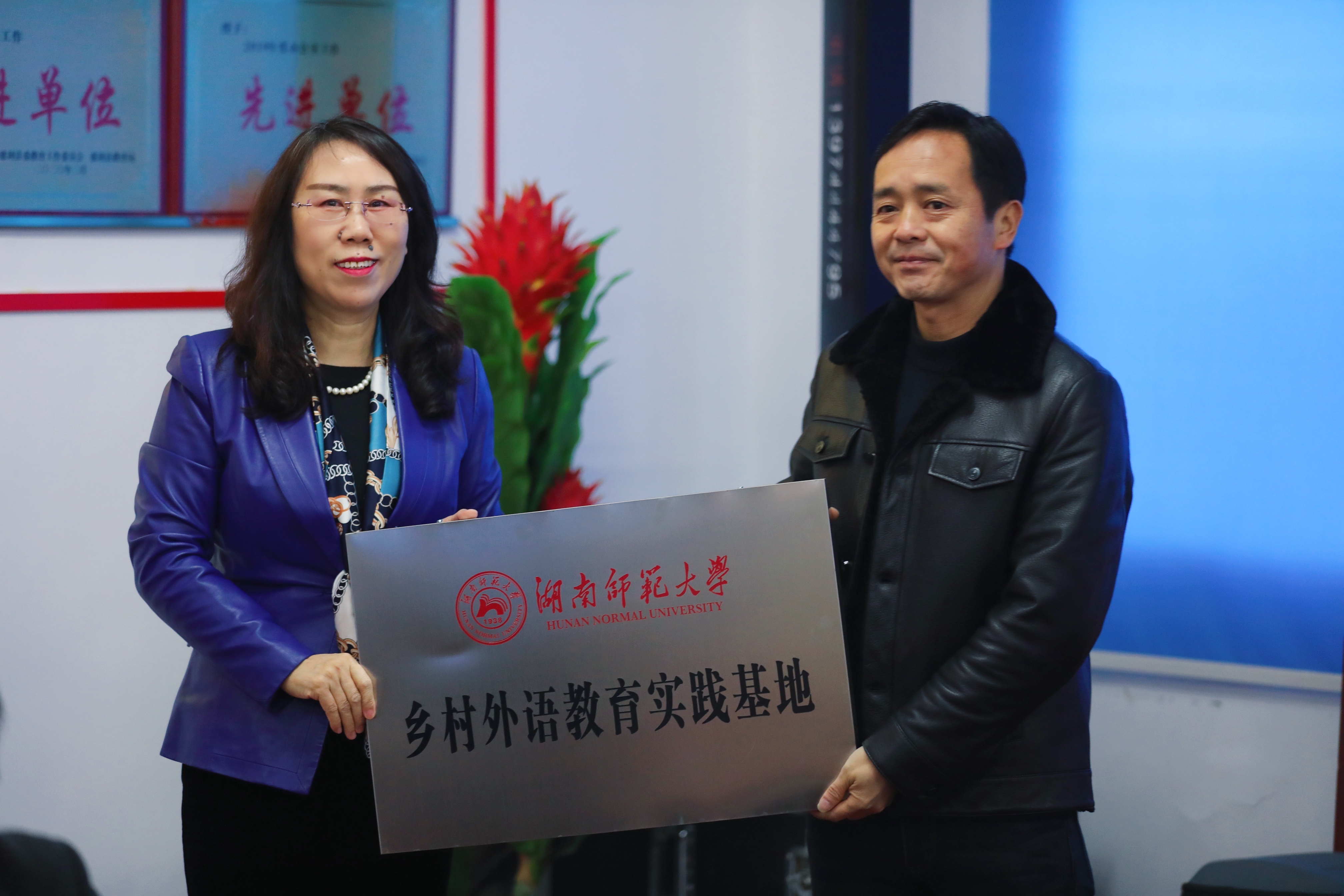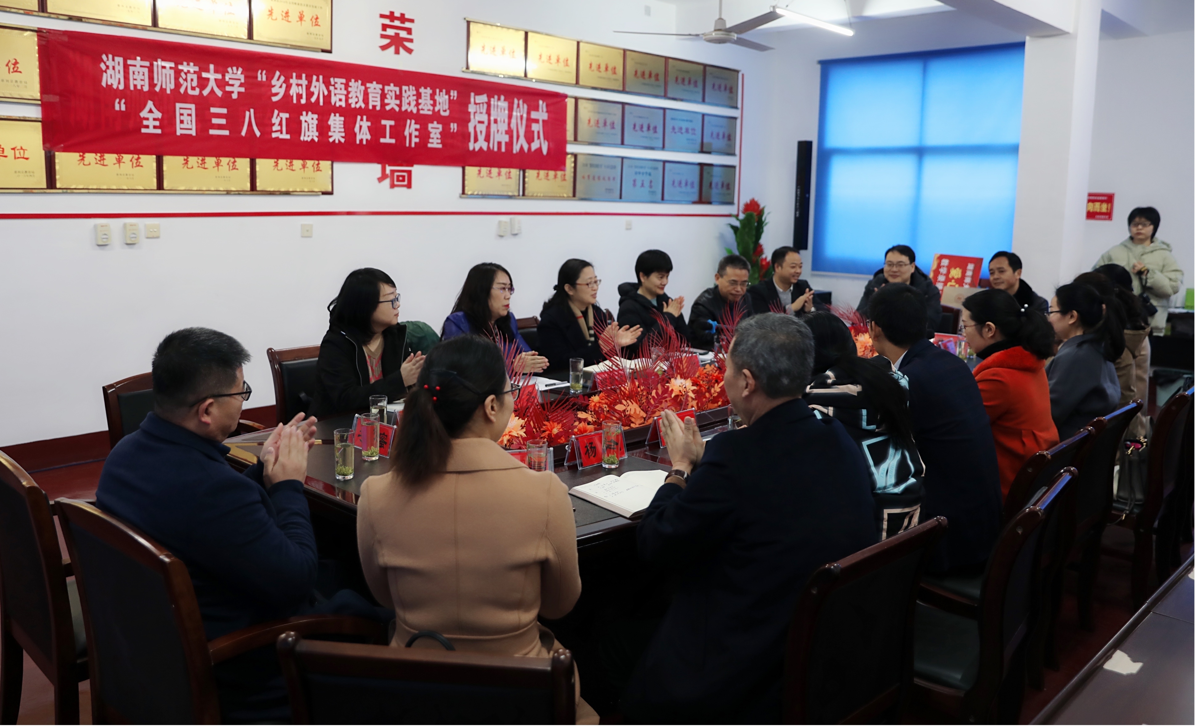 钟斌向太阳成集团tyc33455cc官网外国语授“全国三八红旗集体工作室”牌匾,太阳成集团tyc33455cc官网在东岳观镇中学挂牌成立“乡村外语教育实践基地”。