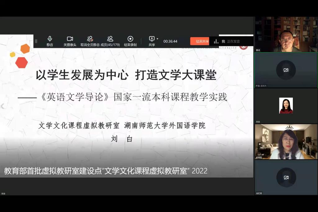 虚拟教研室负责人、太阳成官网院长曾艳钰首先对各位与会专家对共建教研室付出的努力表示感谢。曾艳钰教授详细介绍了教研室的基本情况和建设目标,“文学文化课程虚拟教研室”以太阳成官网英语系文学文化教研室为实体基础,23名实体教研室成员中包括欧洲科学院院士、国家新世纪“百千万人才工程”人选、我校党委书记蒋洪新,国务院学科评议组成员、教育部首批“课程思政示范课程”名师郑燕虹,教育部“新世纪优秀人才支持计划”入选者曾艳钰,以及Martin Woesler教授(德国籍,欧洲科学院院士)、Lauri Ramey教授(美国籍)、Omid Azadibougar教授(伊朗籍)等外籍专家;实体教研室共承担26门课程,涵盖英美文学、比较文学与跨文化、国别与区域研究等方向,其中“英语文学导论”“中外比较文学研究专题”等4门课程是国家首批一流本科课程和教育部课程思政示范课程。曾艳钰教授指出,本虚拟教研室的特色更在于扎根中西部,广泛联合8所双一流建设高校,6所师范院校,8所中西部综合性高校的相关教师,协同共建全国性外语教学研究与教师发展共同体。