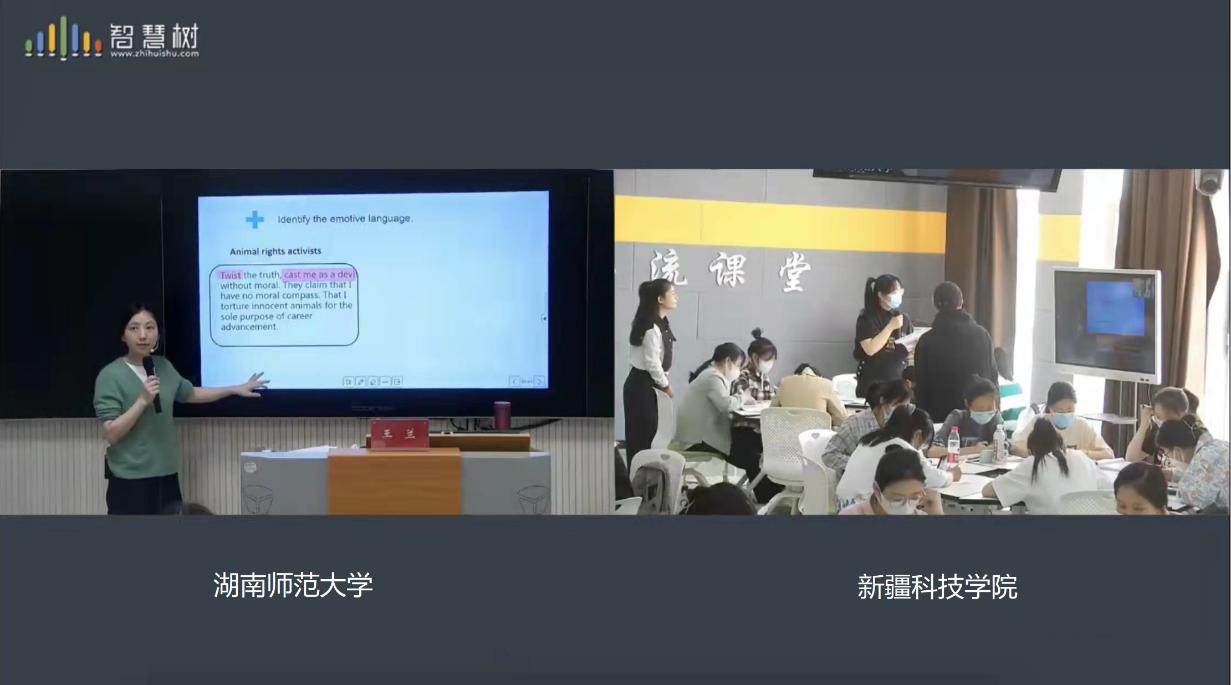 启动仪式后,太阳成集团tyc33455cc官网青年教学能手、全国高校外语课程思政教学比赛特等奖获得者王兰老师在太阳成集团tyc33455cc官网601智慧教室,通过智慧树网的直播互动平台,开启了与新疆科技学院400余名学子的《大学英语二》课堂云同步,利用智慧树网的课堂工具,王兰实现了两地点名、投票、答疑等教学环节。整堂课程呈现流畅,学生互动积极,王兰老师严谨的教学态度、精巧的教学设计、亲和的教学表现得到了两校学子的肯定与喜爱。