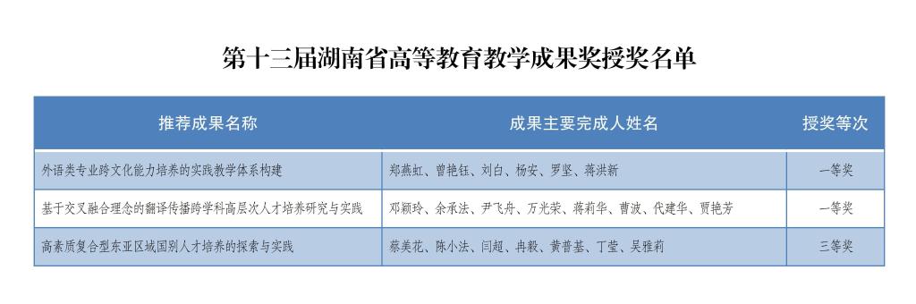 (供稿 教务办)近日,湖南省教育厅公布了第十三届湖南省高等教育教学成果奖获奖名单,外国语言文学学科三项成果全部入选。其中,《外语类专业跨文化能力培养的实践教学体系构建》和《基于交叉融合理念的翻译传播跨学科高层次人才培养研究与实践》获一等奖,《高素质复合型东亚区域国别人才培养的探索与实践》获三等奖。