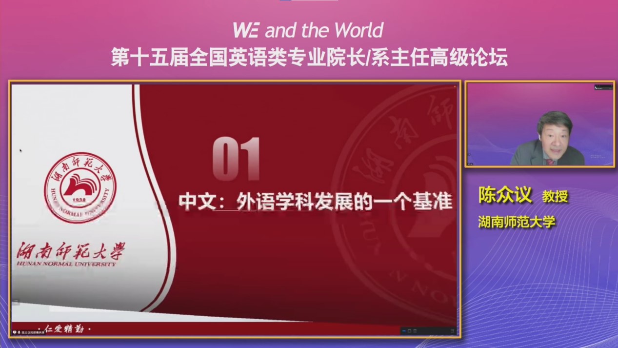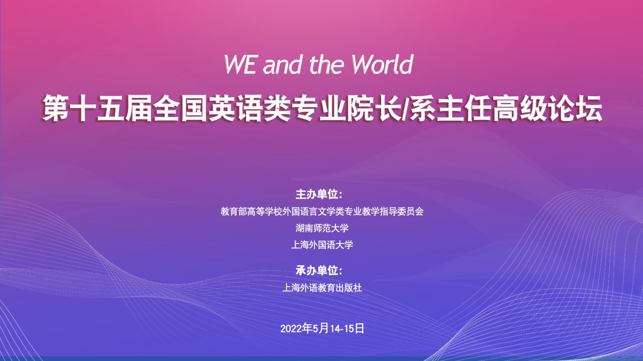 (通讯员 胡桑 王耀光)5月14日上午,第十五届全国英语类专业院长/系主任高级论坛在线上拉开帷幕。本次论坛以“WE and the World”为主题,由教育部高等学校外国语言文学类专业教学指导委员会、上海外国语大学、太阳成集团tyc33455cc官网联合主办。教育部高等学校外国语言文学专业教学指导委员会主任委员孙有中,上海外国语大学校长李岩松,我校党委书记、欧洲科学院院士蒋洪新等出席论坛开幕式并致辞,论坛开幕式由上海外国语大学副校长查明建教授主持。