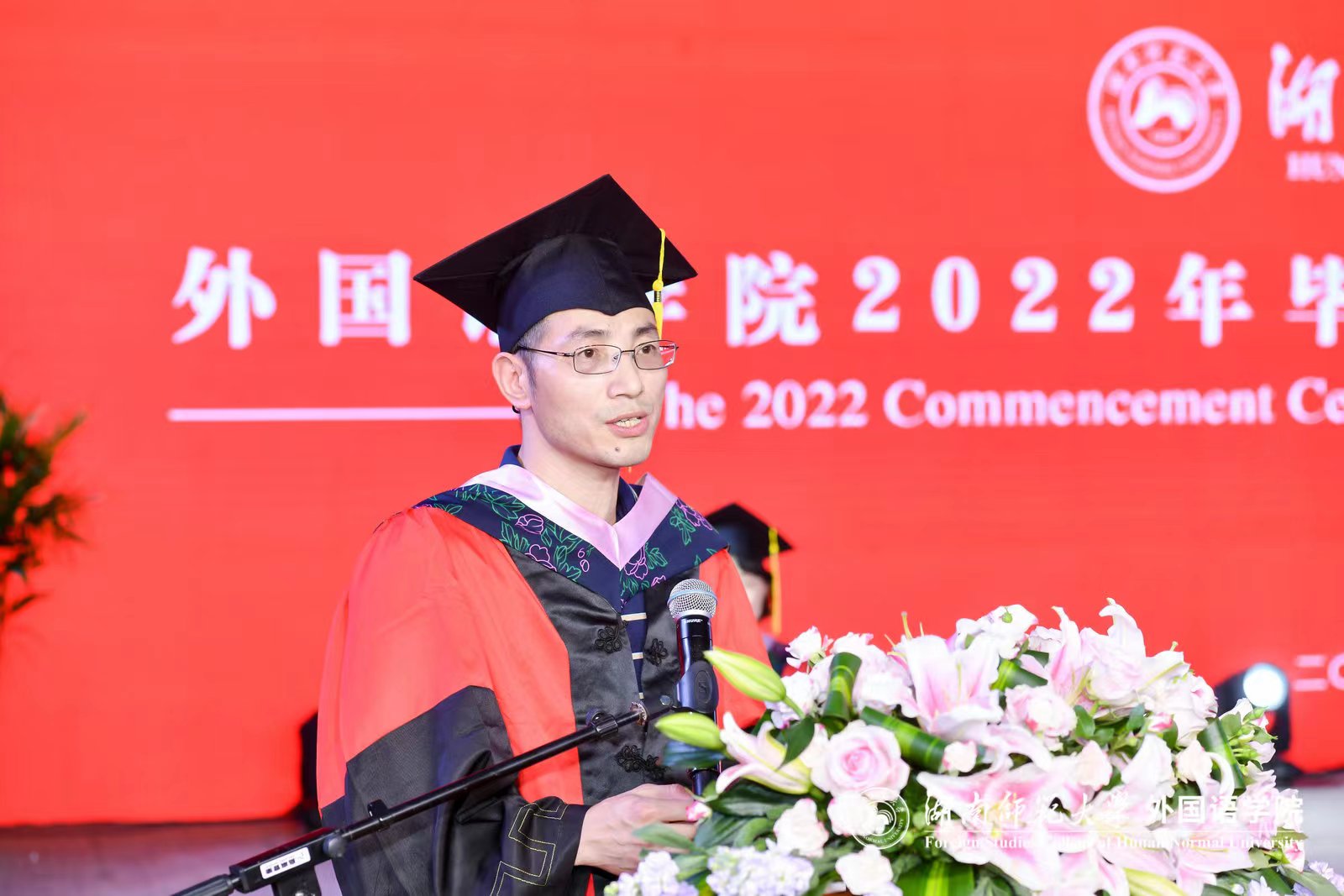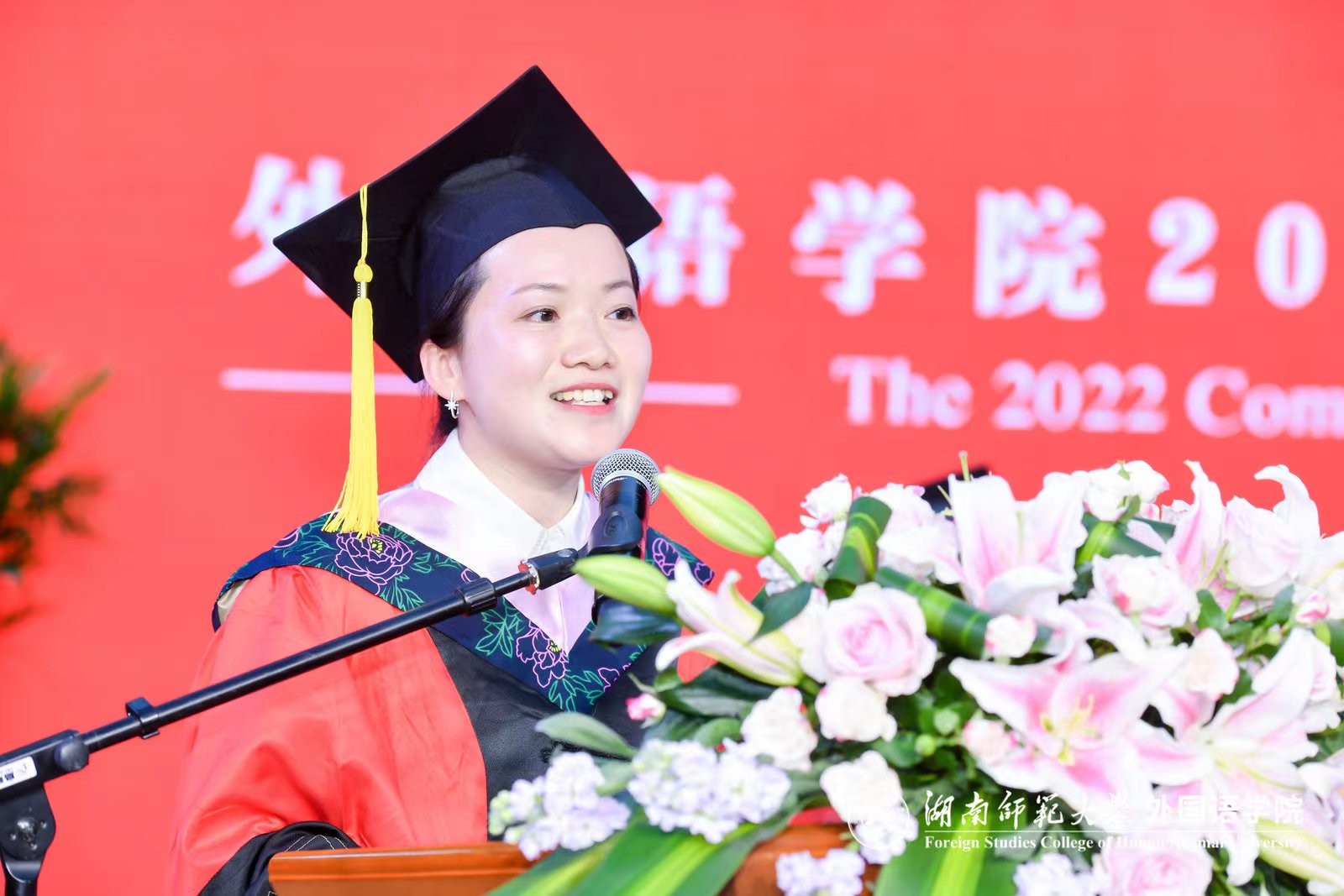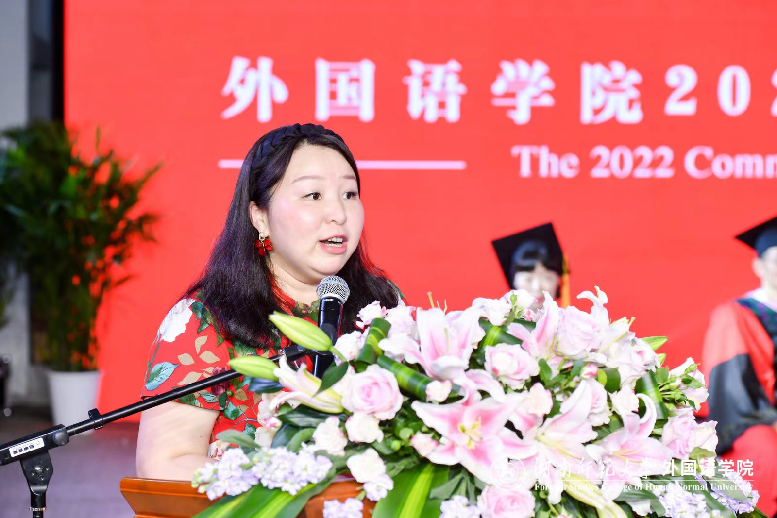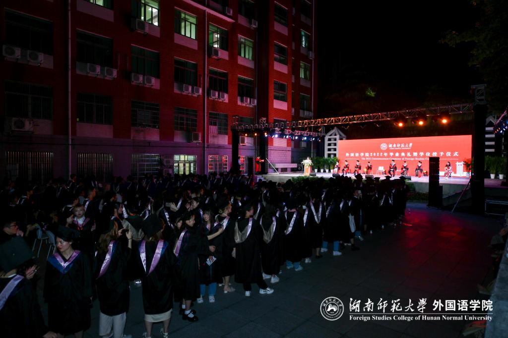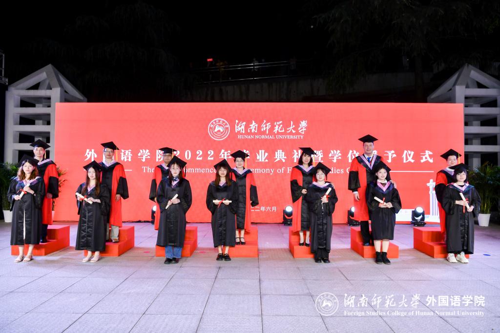仪式前,学院举行了毕业生文艺晚会,2022届毕业生带来精彩的节目表演。学院英语、俄语、日语、翻译、朝鲜语、法语、西班牙语、德语、葡萄牙语、阿拉伯语十个本科专业的师生用十种语言共同演唱2022年毕业主题歌《栀子花开》。