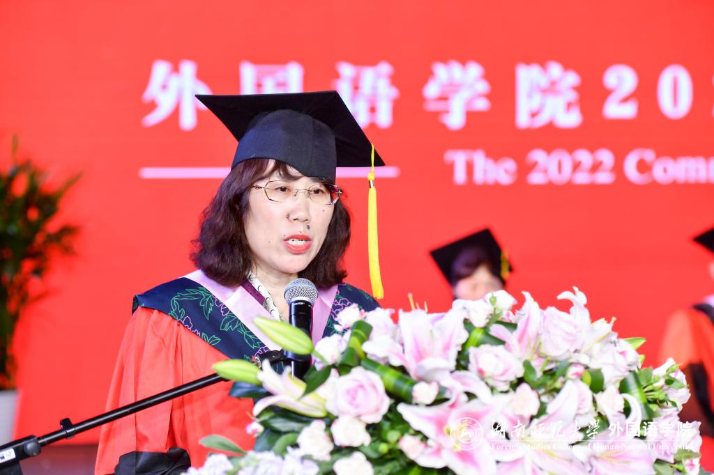 院长曾艳钰教授代表学院对全体毕业生表示热烈的祝贺,向所有关心、支持和帮助各位毕业生成长成才的亲人、师长和朋友表示最衷心的感谢。她回顾了全体毕业生在外院求学的时光,对全体毕业生提出三点希望:一是希望大家做好选择,让专业专长为奋斗助力;二是希望大家接续学习,让丰富阅历为创新开路;三是希望大家笃定坚守,让信仰初心为人生领航。