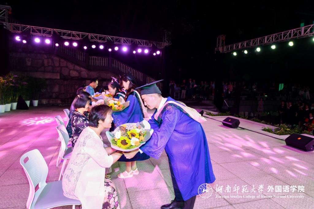 毕业生代表怀揣着深深的感激之情向教师献花。