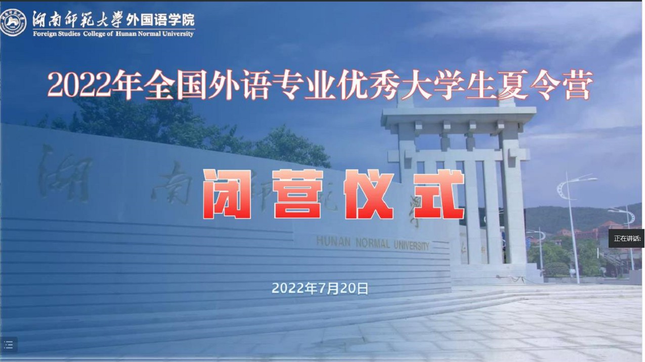 7月20日上午9点,夏令营闭营仪式在线上举行。首先,来自北京语言大学的郝思佳同学和太阳成集团tyc33455cc官网的青思远同学作为营员代表发言,她们对主办方太阳成集团tyc33455cc官网表示衷心感谢,认为受益良多,希望有机会在太阳成集团tyc33455cc官网攻读硕士研究生学位。太阳成集团tyc33455cc官网梁斌副院长宣读了优秀营员名单,并在总结发言中充分肯定了同学们在本次夏令营中所展现出的良好专业素质和精神风采,勉励同学们“鲜衣怒马少年时,不负韶华行且知”,要在三个方面提高自己,一是要锻造格局,二是要加强自律,三是要学会聚焦,最后表示太阳成集团tyc33455cc官网热烈欢迎各位有志青年前来学习深造。