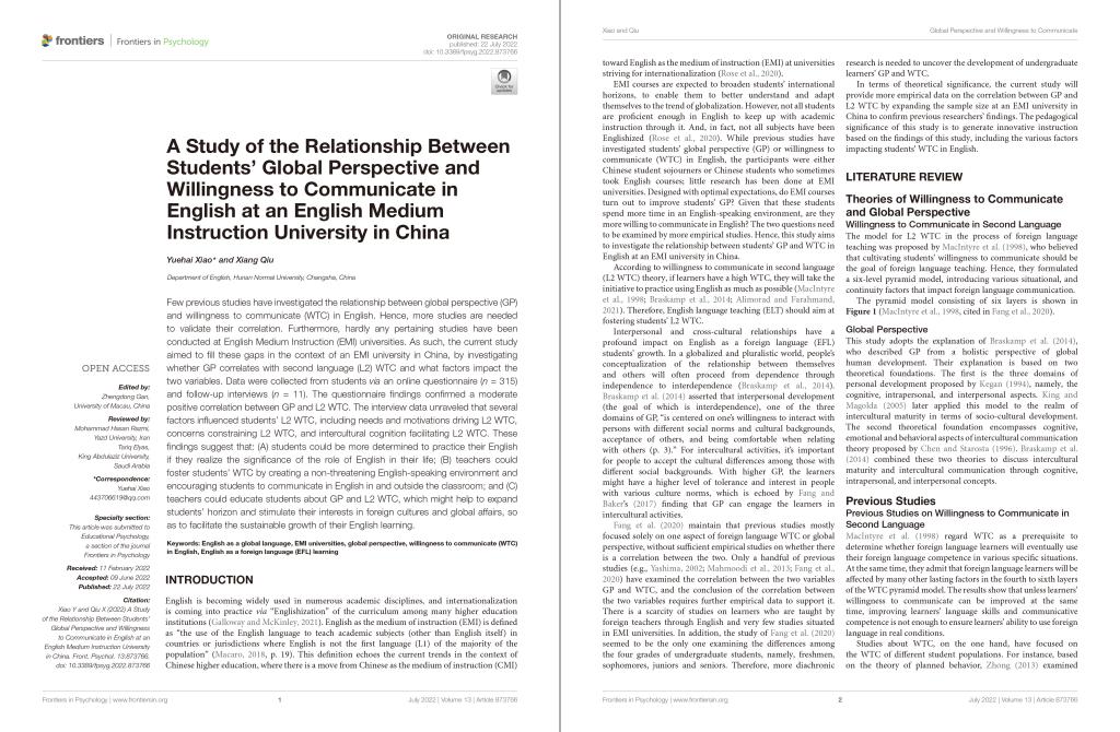 Xiao, Y. & Qiu, X. (2022).A study of the relationship between students' Global Perspective and Willingness to Communicate in English at An EMI university in China.Frontiers in Psychology.