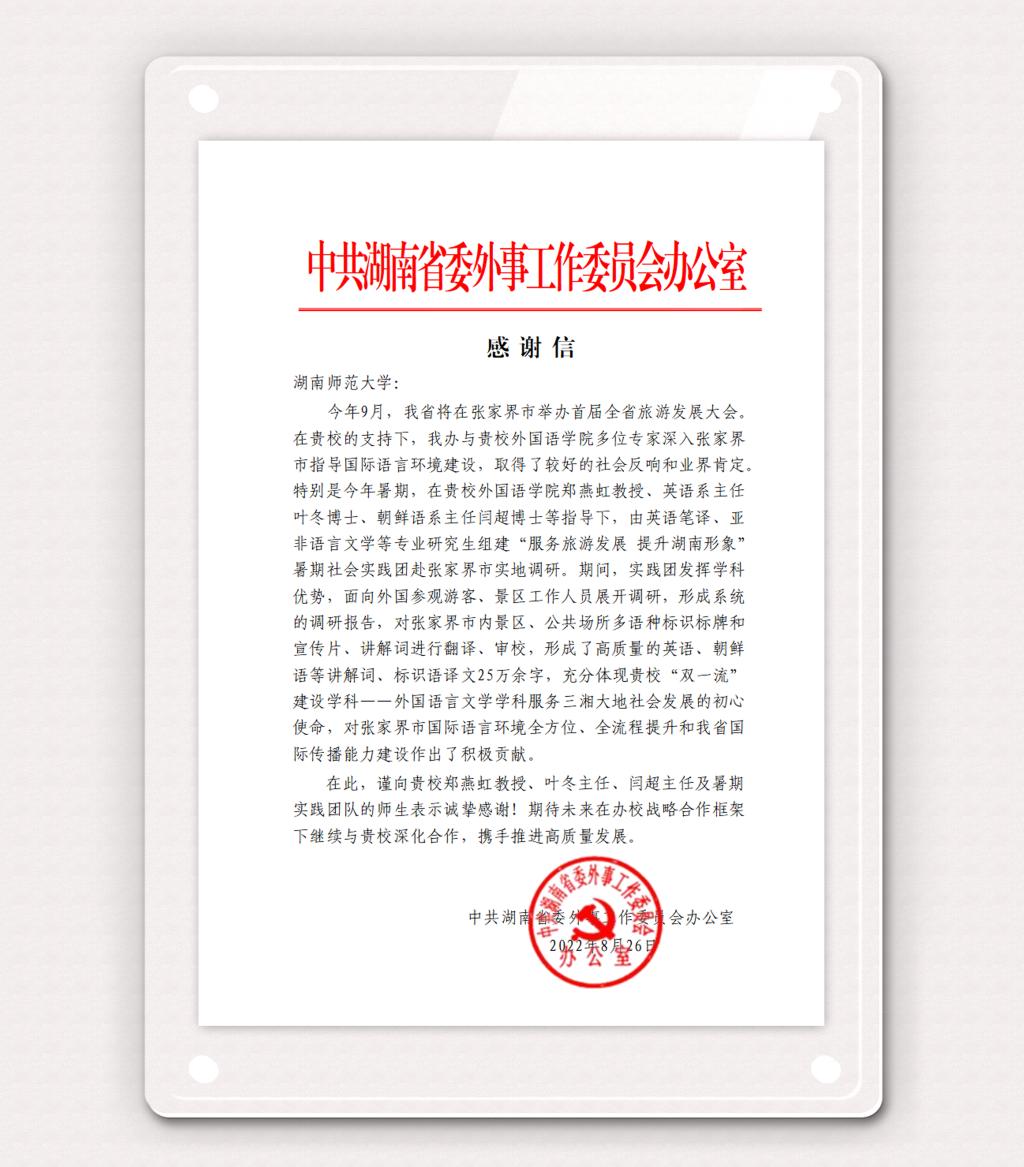 (通讯员 刘越)近日,中共湖南省委外事工作委员会办公室向太阳成官网发来感谢信,对太阳成官网郑燕虹教授、英语系主任叶冬博士、朝鲜语系主任闫超博士带领的“服务旅游发展提升湖南形象”暑期社会实践团在塑造张家界国际语言环境、服务张家界发展中作出的积极贡献表示充分肯定。