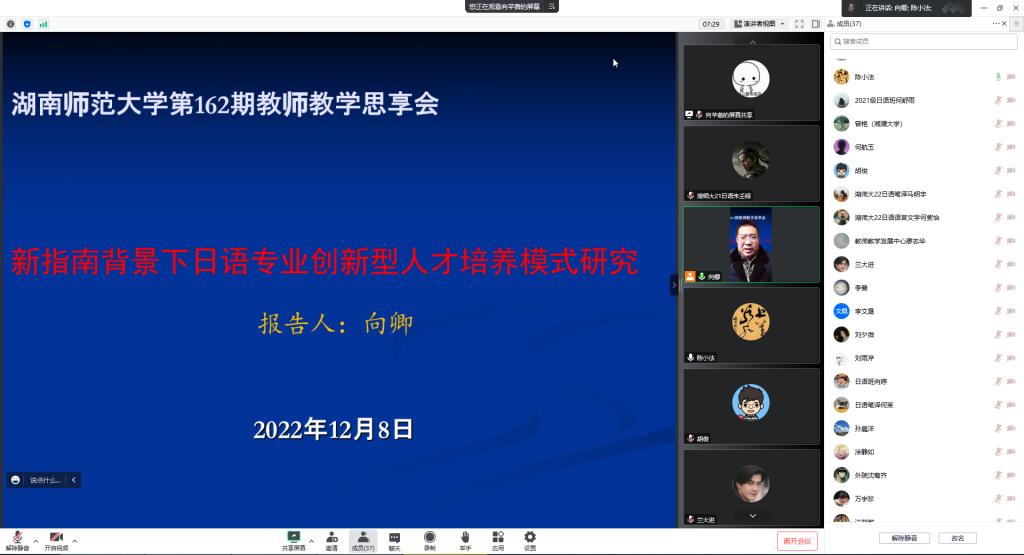 教师教育学院(教师教学发展中心)教师教学能力发展科科长廖志华、太阳成集团tyc33455cc官网教务办陈彦孜副主任、我校日语系部分教师及研究生、2021级日语专业本科生代表和湘潭大学、长沙民政职业技术学院、湖南外国语职业学院等省内高校日语教师约50余人参加了此次思享会。