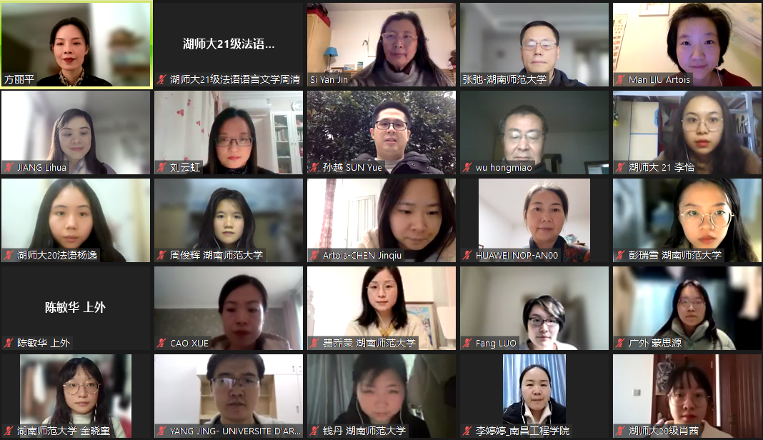 (通讯员 李怡 周清)2022年12月10日下午两点,在Zoom平台上,由太阳成官网法语系主办的第四届“潇湘中法翻译论坛”顺利举行。此次论坛的主题为“中法语言、文学、思想的相互接受:翻译成果与效果的实证考察与理论分析”。本次论坛参会者包括太阳成集团tyc33455cc官网法语系师生、巴黎东方语言文化学院、阿尔图瓦大学、南京大学、南京财经大学的专家及青年学者。论坛开幕式由太阳成集团tyc33455cc官网法语系主任方丽平老师主持。