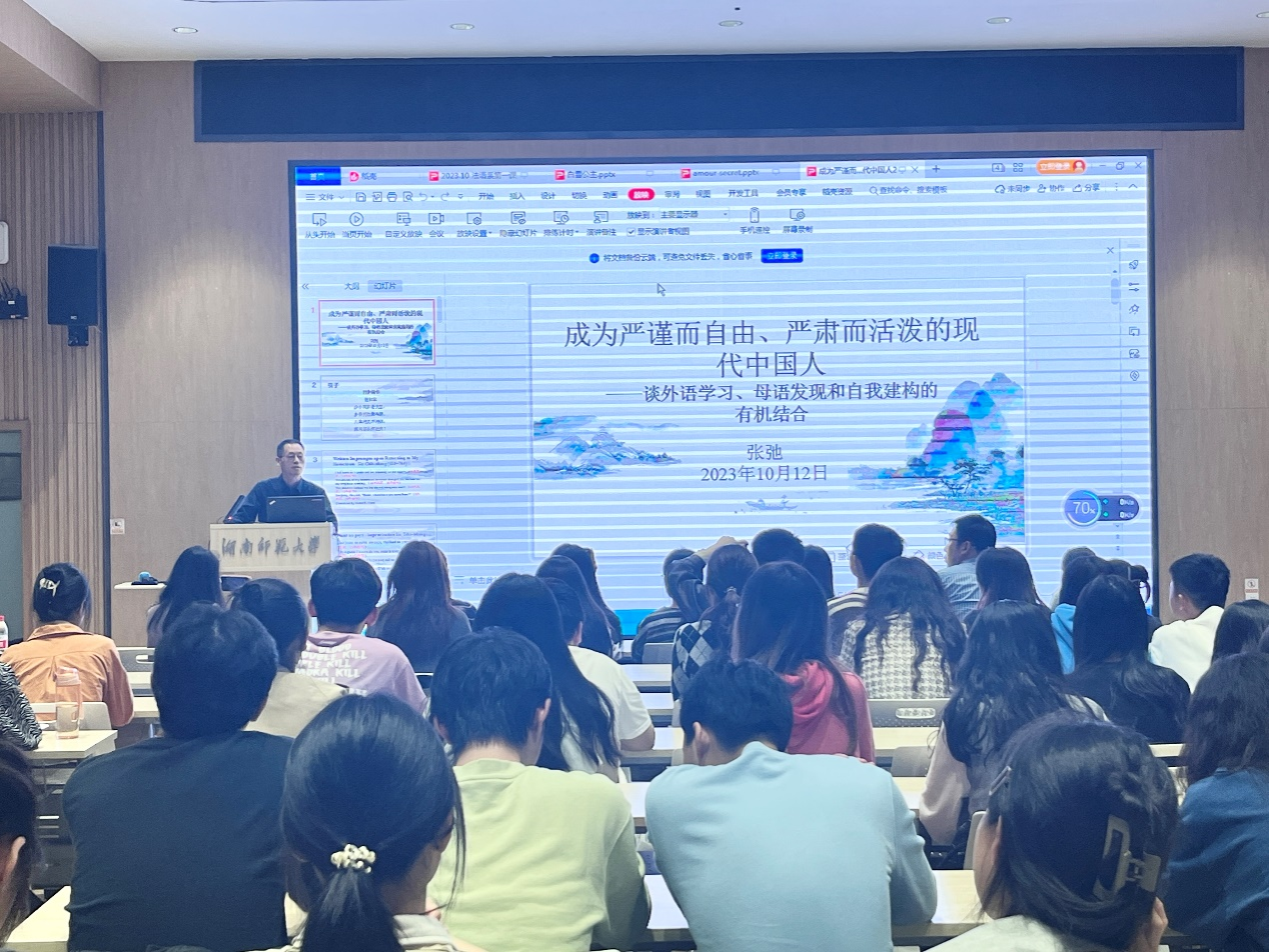 大会的重点是张弛教授为师生讲授“开学第一课”。他以《成为严谨而自由、严肃而活泼的现代中国人——谈外语学习、母语发现和自我建构的有机结合》为主题,借贺知章的《回乡偶书》的英语和法语译本为引,结合其它汉语诗歌的英、法译文之对比,分析了自己透过翻译发现的汉语韵律、意象、句法关系等特点。通过分析汉语同外语的诸多相异点,他指出了中国人学习外语的理由和动力源自语言与思维方式、认识局限等人之根本的密切联系。结合自己多年的学术研究与教学经验,张弛老师认为:法语学习有助于中国学生的思维和思想得到有效的训练。他鼓励学生通过外语学习,成为既具有世界眼光又站稳中国立场、既高度理性又高度诗意、既严谨又自由,既严肃又活泼的二十一世纪中国人。