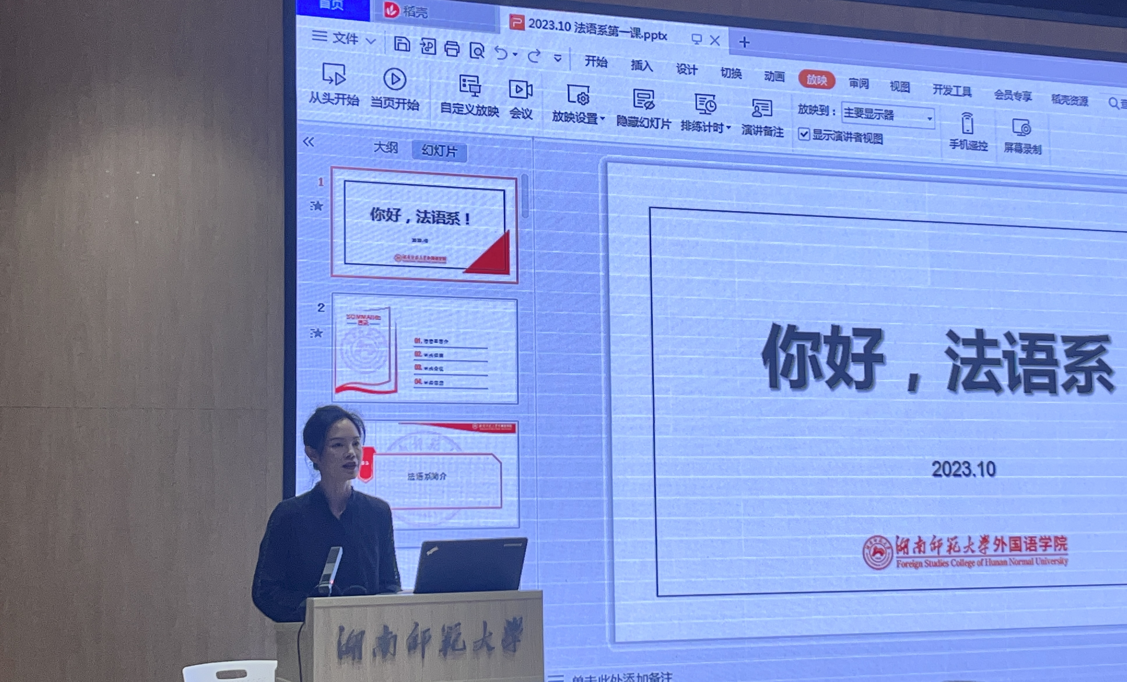 会议伊始,方丽平作开场白致辞。她表示,“开学第一课”的传统为法语系首创,已成功举办三次。方老师回顾了法语系上学期举办的多场高端学术论坛、学术讲座及多彩的学生活动。她向大类分科后的2022级本科生和2023级硕博新生表示诚挚欢迎,并向他们介绍了法语系的老师们。