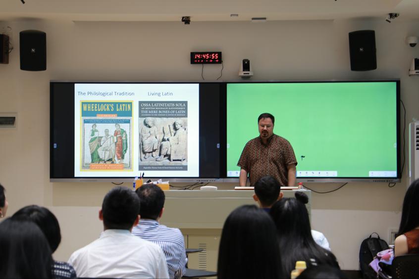 主讲人David Andrew Porter作题为“论雷金纳德•福斯特的语言教学法”的汇报。David教授介绍了雷金纳德•福斯特个人生平及其在拉丁语教学中的教学经验,并讲述该教学经验对英语教学的启示,强调在文本中学习语法、利用词典学习语言的重要性。
