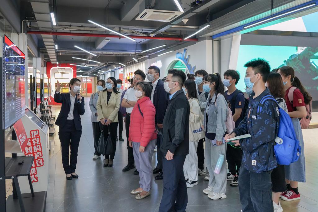 在创智园1号栋展厅,课程学生们深入学习了习近平总书记在马栏山视频文创产业园的重要讲话精神,全面了解了马栏山视频文创产业园从无到有、逐渐壮大的发展历程,重点参观了依托电影4K修复、AI人工智能实时新闻手语播报、虚拟主持人、5G智慧电台等代表性技术衍生的湖湘文化精准国际传播产品。当看到文创产业园青年从业者通过AI修复技术让电影《雷锋》从黑白变成了彩色,从胶片电影变成了更易存储、传播的数字电影,借助手语虚拟主播为全国2700万听障人士提供新闻播报的手语翻译,利用5G+AI技术让一个编辑在短短3分钟内“闪”编包括虚拟主持人在内的一套电台节目时,学生们对如何将文化和技术结合讲好中国故事有了更深层的思考。