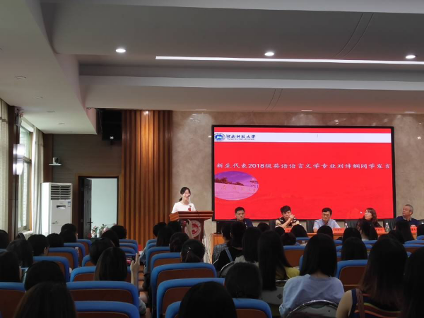 随后是学生代表发言环节。2017级老生代表曾威同学向同学们分享了自己的学习经验,鼓励新同学多多发文;2018级新生代表李诗娴同学回顾了曾经求学的不易,并代表新生喊出“路漫漫其修远兮,吾将上下而求索”,以此开启新的学术旅程。