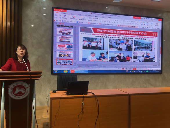 曾艳钰院长着重介绍了四川大学在本科教育改革方面的亮点,她结合学院实际,从人才培养、科学研究以及社会服务三方面提出了学院的发展目标。她表示学院将在线开放课程、双创项目等方面加快建设步伐,进一步加强学风建设,努力实现“一流大学要有一流的本科”的目标。学院还将全面启动“学学半”系列丛书的编纂,加强对教师申报省部级项目的支持力度。曾艳钰鼓励老师们能充分发挥学科优势,积极对接国家与社会需求,服务基础教育、积极参与“一带一路”研究。最后她殷切希望每一位教职工都能在这历史性机遇面前,以饱满的热情积极主动认真做好每一项工作,为同一理想而共同奋斗。