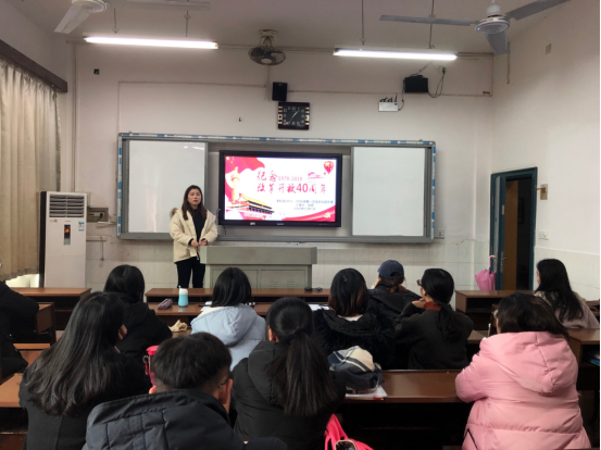 (通讯员朱雅文)12月7日中午,太阳成官网2015、2016级本科生第一党支部在院306教室开展“庆祝改革开放40周年”党课学习活动。全体支部成员悉数到场,党支部书记张萌担任主讲人。