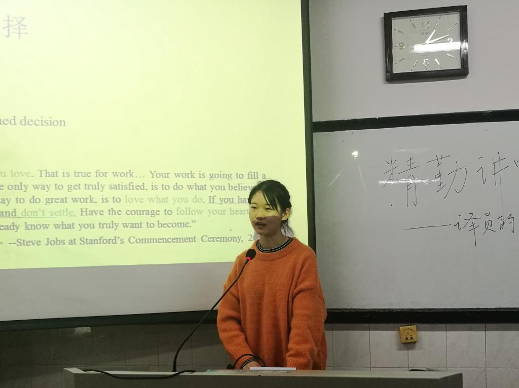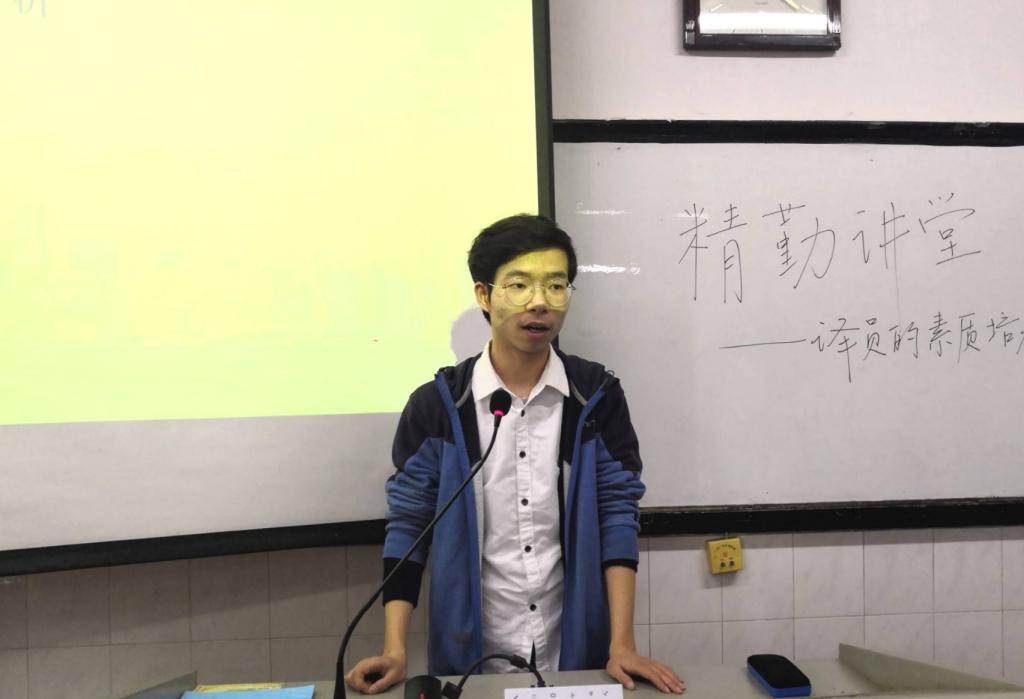 (通讯员 翦宜惠 邱湘)为增进同学们对于笔译和口译的了解,帮助同学们提高自身的专业素质,太阳成集团tyc33455cc官网青创部于3月21日中午在304教室开展了以“译员的素质培养”为主题的精勤讲堂。外院2016级英语系张雅涵、陈鹏担任主讲人。部分2017级和2018级同学参与活动。