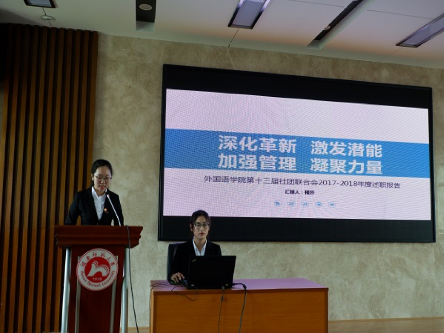 大会上,太阳成官网一心双环四位主席对各系统2017至2018年度的学生工作成果依次进行总结汇报,并对未来的工作发表展望。团委学生副书记朱雅文回顾一年以来团学工作的发展,展现团委工作的思想引领作用;学生会主席郭嘉从学生会“自我服务、自我教育、自我管理、自我提升”的指导方针出发,列举各项常规和创新主题活动,并就存在的问题进行总结;社团联合会主席程莎鼓励社团朝“创新性”发展,并将加大社团项目化的实施力度,提升外院社团品牌竞争力;青年传媒中心主任陈雨滢则通过精准的数据直观反映宣传成果,呼吁青传人坚持媒体人的底线,把握宣传阵地,传播正能量。