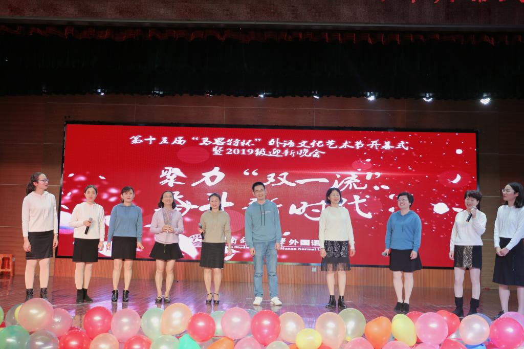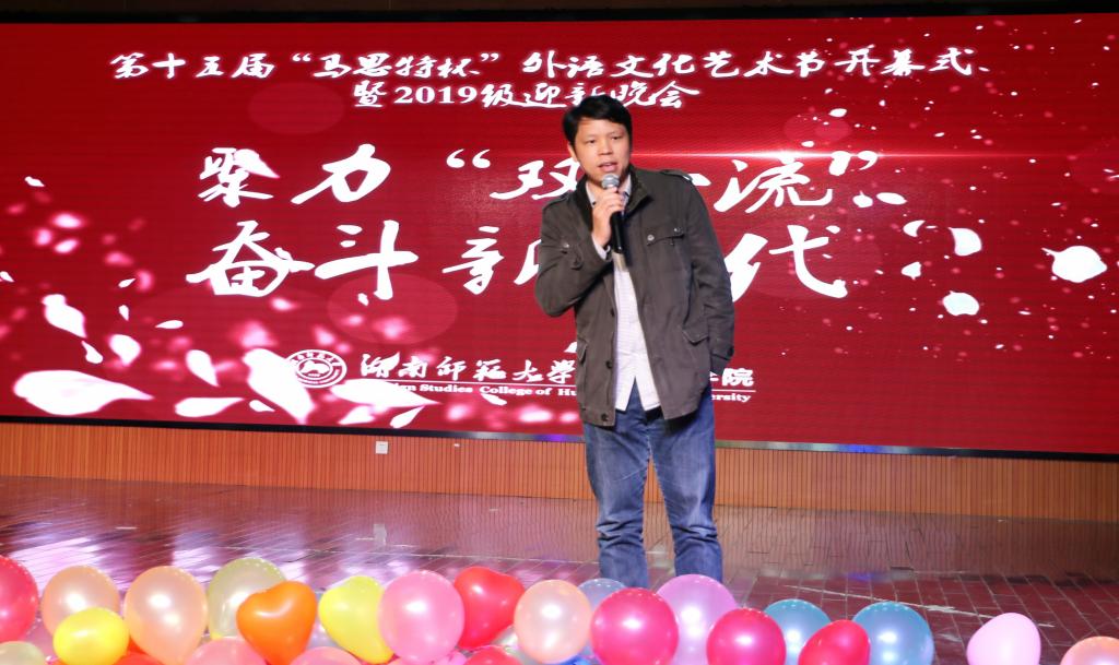 (通讯员 夏秦萍 龚柯翰 常红钰)11月22日晚,太阳成官网在江边活动中心举办了以“聚力‘双一流’,奋斗新时代”为主题的第十五届“马思特杯”外语文化艺术节开幕式暨2019级迎新晚会。长沙马思特教育集团人力资源部总监徐文娟,太阳成官网党委副书记贺慧星、英语系副主任陈忠平、日语系系主任向卿、法语系系主任王芳、俄语系系主任助理曾永兴参加晚会。