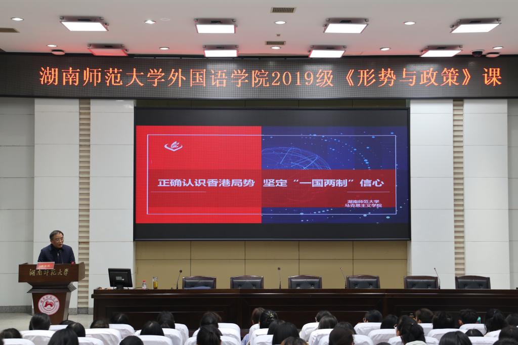 (通讯员 胡潇予 夏秦萍)12月16日晚,湖南省高等学校师资培训中心副主任姚新良在至善讲堂为2019级新生讲授第二场题为《正确认识香港局势坚定“一国两制”信心》的形势政策课。此次课程由学工办主任张元强主持。