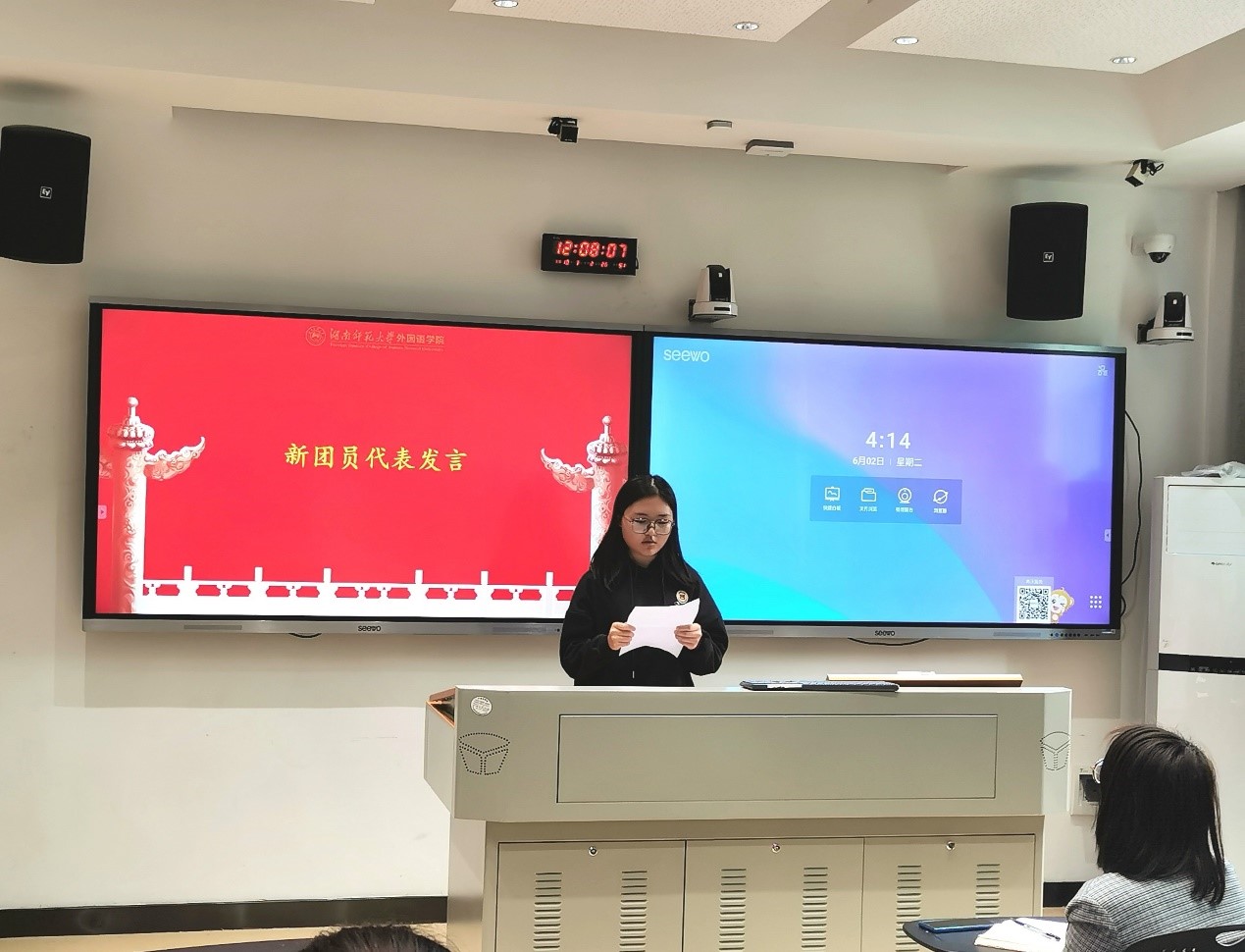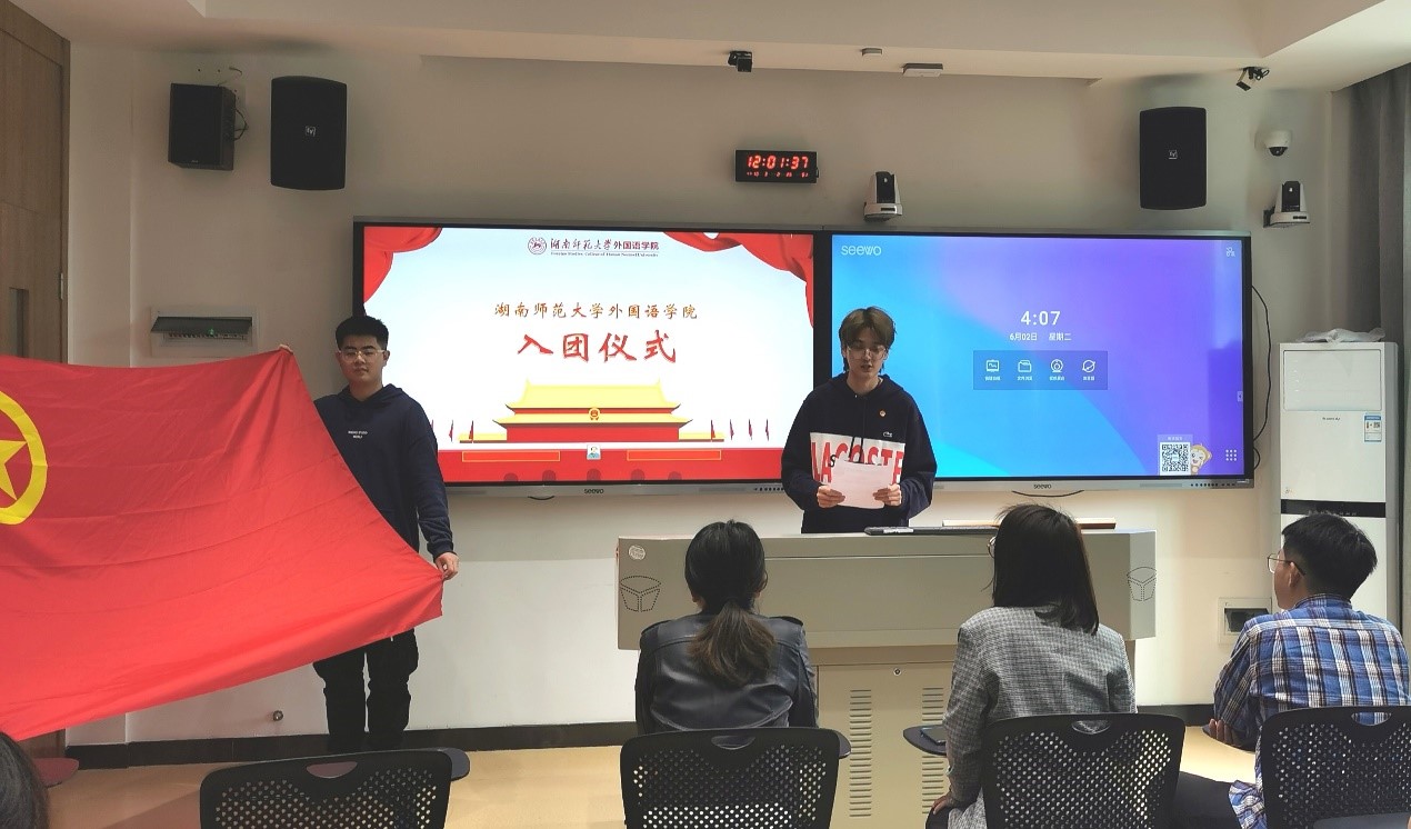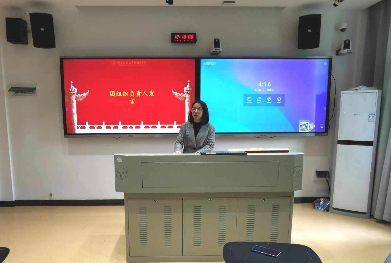 在此次仪式中,新团员们面向团旗宣读入团誓词,表达成为一名光荣共青团员的愿望和决心。2019级日语班孙培菲代表全体新团员发言。学工办姚雯老师对此次仪式进行总结,阐明其必要性,提出对新团员的希冀。