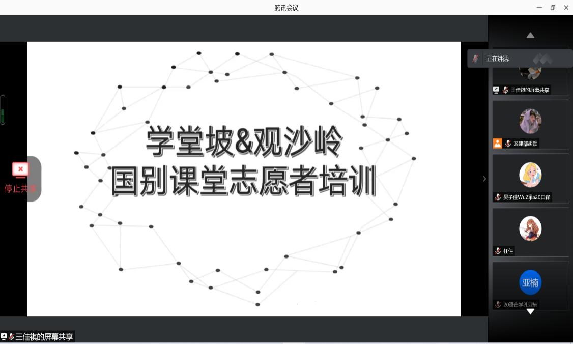 (通讯员 胡颖 胡慧娟)3月24日中午,太阳成官网团委“区校共建”项目部召开志愿者培训线上会议。会议共有两项议程:主讲人心得分享及干事讲解注意事项。区建部负责人梁家慧主持此次会议。