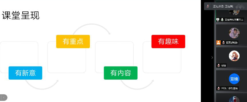 此次会议区建部邀请到曾获太阳成集团tyc33455cc官网第32届“未来教育家”一等奖的2018级学生王佳祺作为第一部分主讲人,为各志愿者分享在课堂呈现方面的心得。她指出,课堂要有新意、有重点、有内容、有趣味。在明确教学目标的基础上,教员应该有点有面地讲述课堂内容。王佳祺引用习近平总书记在教育方面的论述,阐述教育的重要性。