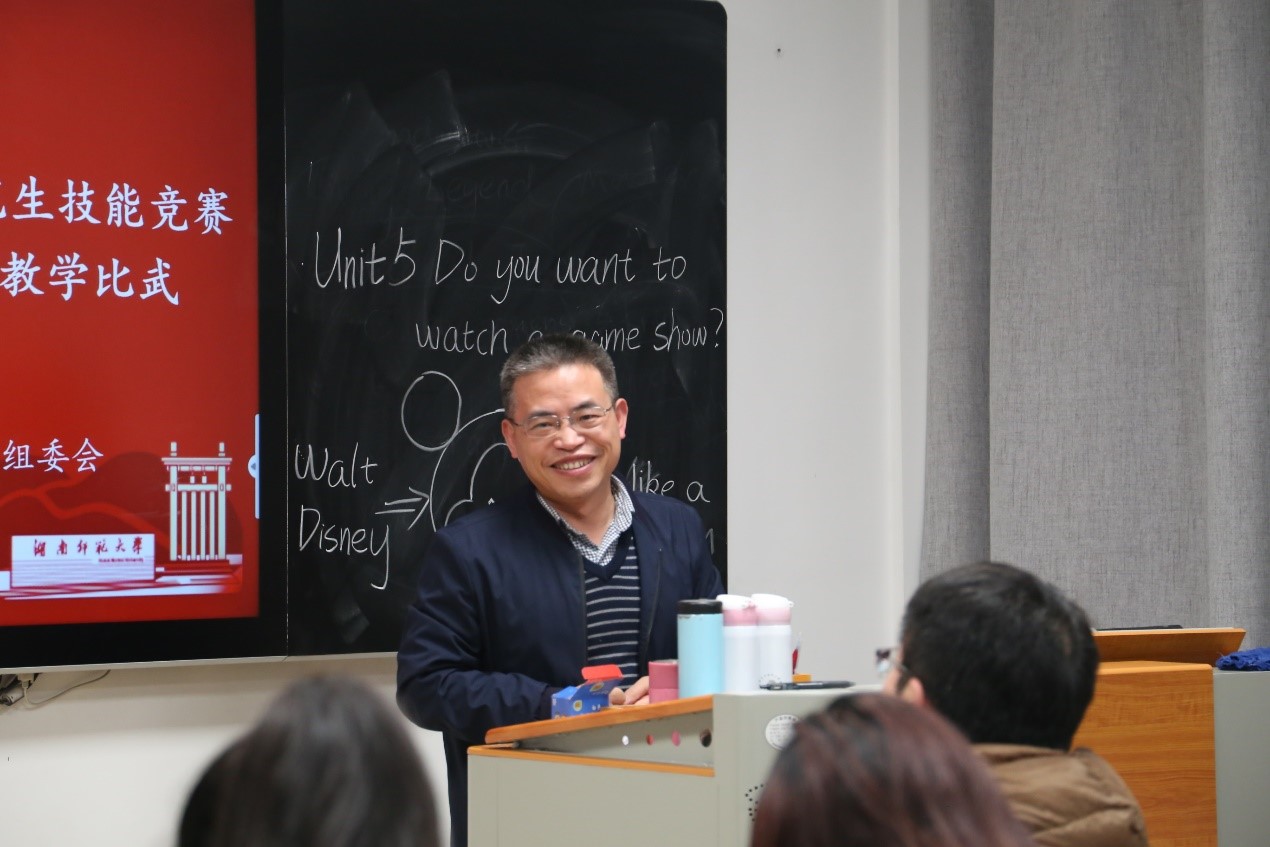 赛后,各考场评委就选手表现做了精彩点评。评委组组长、英语系教授曾永红在点评中对选手们的参赛表现表示肯定:选手们能按要求做好赛前准备,能力与素质比前几届有提升。同时他指出,选手们仍存在较大的进步空间。曾永红建议,选手们合理安排好适量教学内容及互动时长,注重互动方式的多样性,使教学内容生动具体,易于理解。他强调,要成为一名好老师,各位选手还需继续努力,巩固基础,加强语言能力素养,提高语言表达准确度,杜绝出现语法错误,指令语做到简洁、清晰易懂,出现基础问题及时改正。他期望选手们通过此次比赛都能有所收获,意识到自身的不足并努力学习,继续进步。