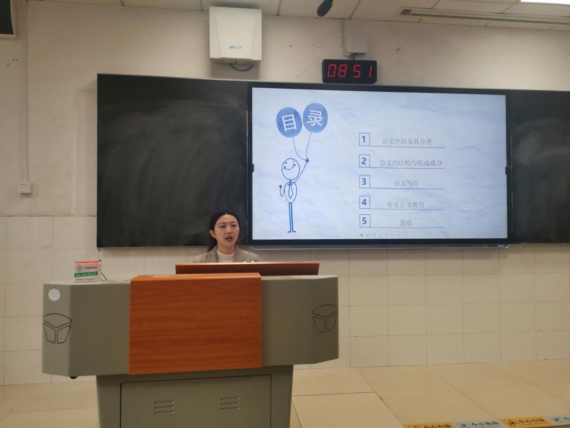 刘伊宁介绍了公文编排的相关知识,重点讲解了公文的分类、结构与组成部分、公文写作,以及盖章的要求。为了让同学们有更清晰的认识,刘伊宁举例来说明公文的结构,同时强调公文写作的语言与写作特点。